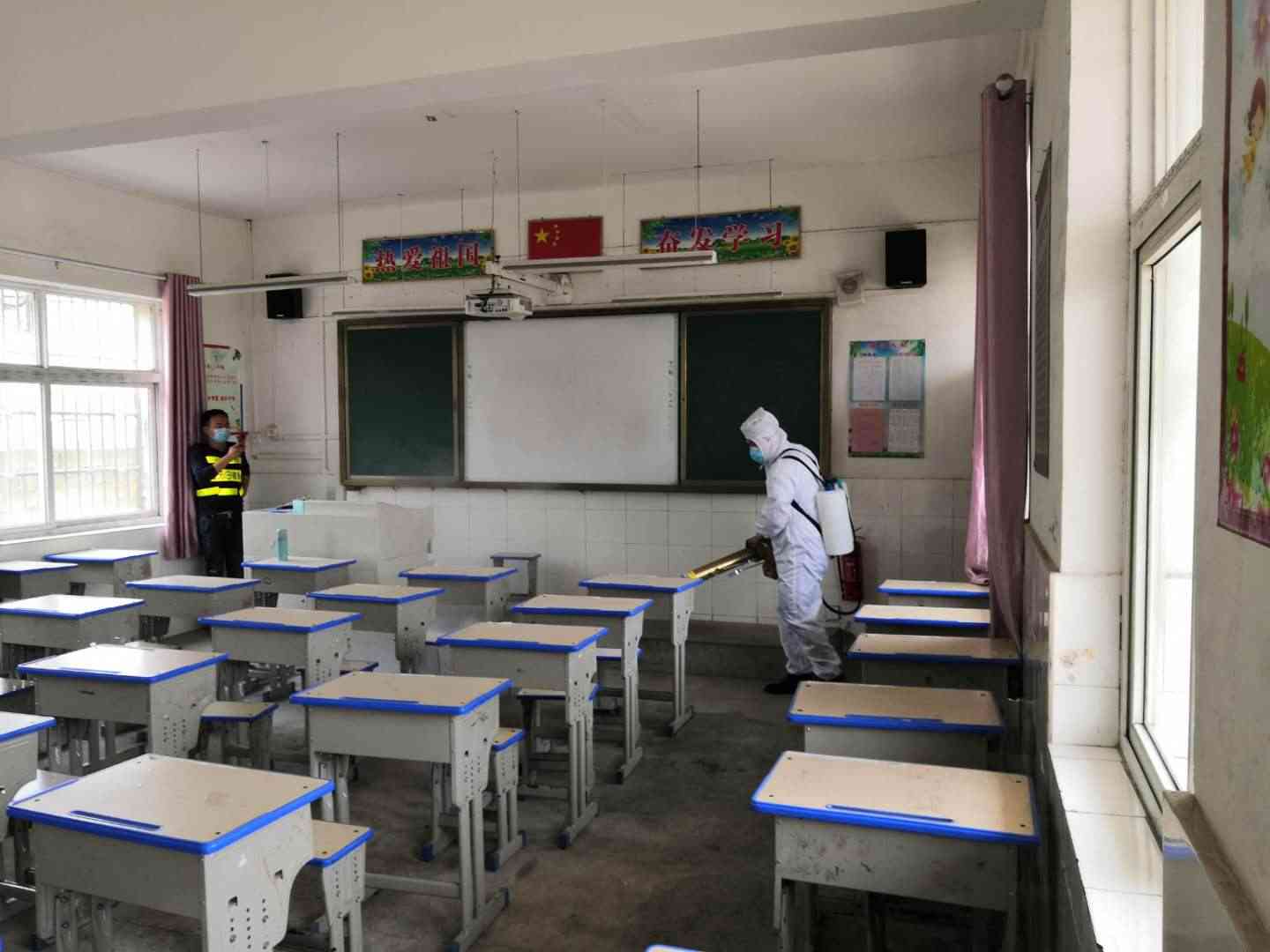 爱心无界,共筑蓝天。定远“蓝天救援队”走进定东小学开展校园消毒迎复学。 4月22日下午,定远县蓝天救援队志愿者们自备防护服、喷雾器、手套等消毒必备品,走进定东小学,对校园的各个区域进行全面消毒。(徐林娜)