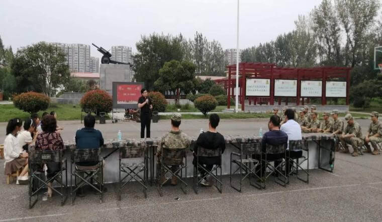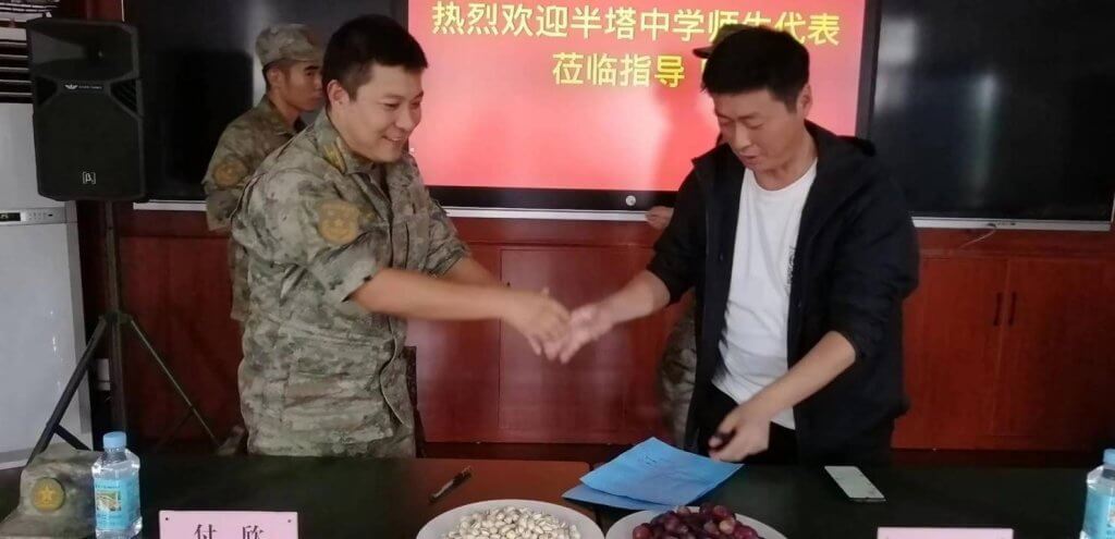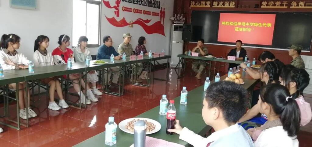 ~ 刚进营地,温暖热烈的气息扑面而来,官兵们列队鼓掌欢迎半塔中学一行的到来,中校傅欣营长等人热情的把大家请进某连接待室,接待室里已准备好了点心和饮料,师生们顿觉亲切。双方领导作了简短而亲切的交谈,虽从未谋面却有一见如故之感。在亲如鱼水的氛围中,邬广明校长与傅营长共同签定了“军民共建协议书”。