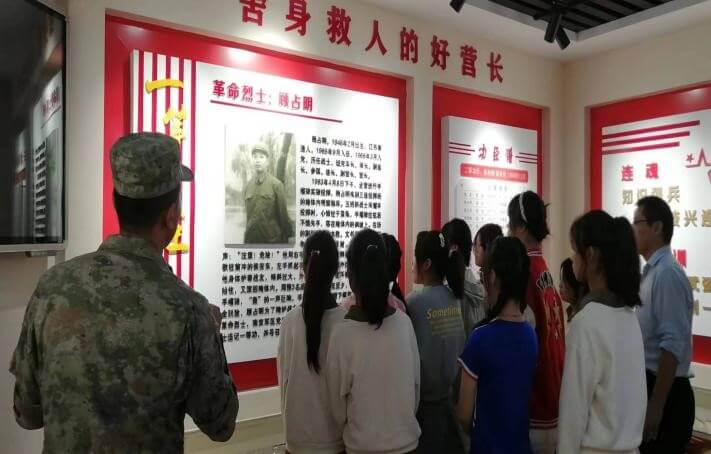 ~ 讲解员领着大家来到烈士墙前,深情地讲述好营长顾占明在训练场上舍身救战友的感人壮举,同学们聆听着讲解,瞻仰着烈士遗照,肃然起敬,神情庄重严肃。