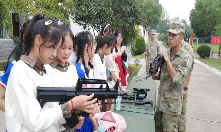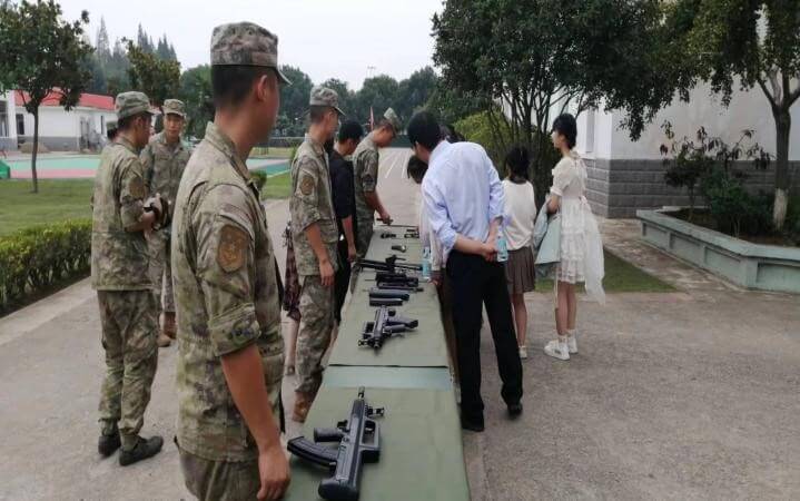 ~ 走出连史室,大家来到铺着绿帆布的长条桌旁,桌上放着几支步枪和手枪,大家兴奋的围了过去,拿一拿,摸一摸,瞄一下准星,扳一下勾机,爱不释手:终于看到摸到真枪了!几位战士为大家演示了持枪动作要领,展示了枪支拆卸与安装技能。讲解了枪械射击原理。几位女生拿起枪支轻轻地比划着,不时传出喜悦的笑声。