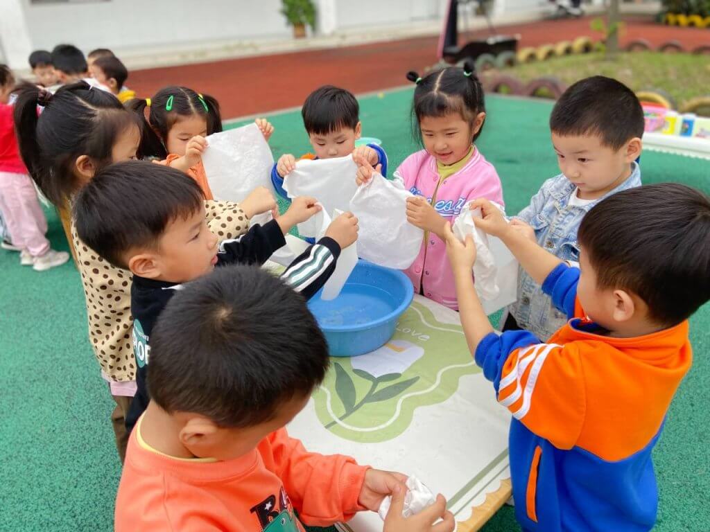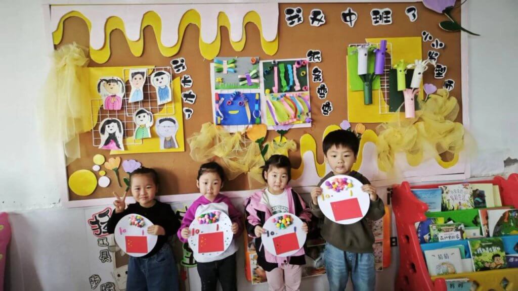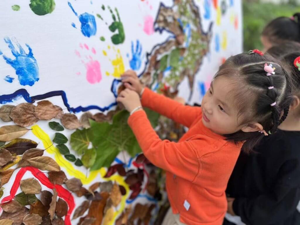 ~ 活动中,老师通过音乐欣赏、图片展示、神话故事等形式,让小朋友了解中秋节的来历和传统习俗;小班用幼儿园的落叶,绘制了祖国的地图,一叶一笔中,厚植爱国情怀;中班用传统扎染手艺,送出对亚运健儿的祝福;大班开展了“中秋月饼”制作,尽管不太好看,但味道很好,体现了他们对祖国和家人的美好祝福。幼儿园的孩子们还通过跨越时空的对话视频为祖国母亲庆生。