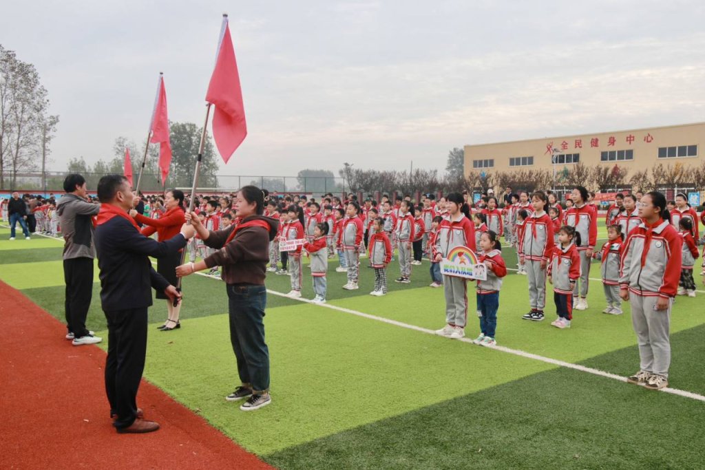 出旗,升国旗,唱国歌,宣读新队员名单;老队员为新队员系上鲜艳的红领巾,新队员回敬队礼,鲜艳的红领巾在新队员胸前飘扬;桑涧小学校长张道胜亲自给新建的中队授中队旗,中队接过队旗,新队员们光荣入队!