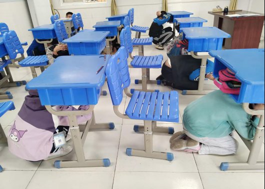 演练过程中,全校师生按照预先制定的逃生线路和逃生顺序进行撤离。当警报响起时,学生们在老师的指令下迅速抱头躲到桌子下方;警报一停,学校老师对学生进行引导,带领学生迅速撤离到操场。
