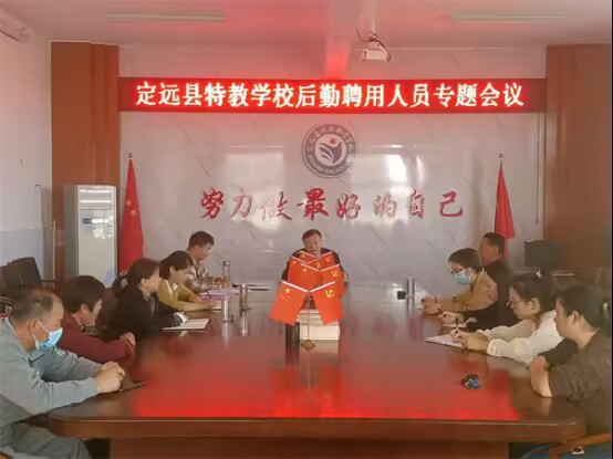 2023年10月14日,定远县特教学校在三楼会议室召开后勤聘用人员专题会议,全体后勤聘用人员参加会议,校长谢庆贵主持会议。