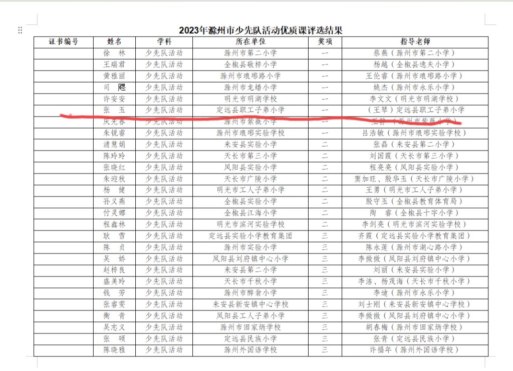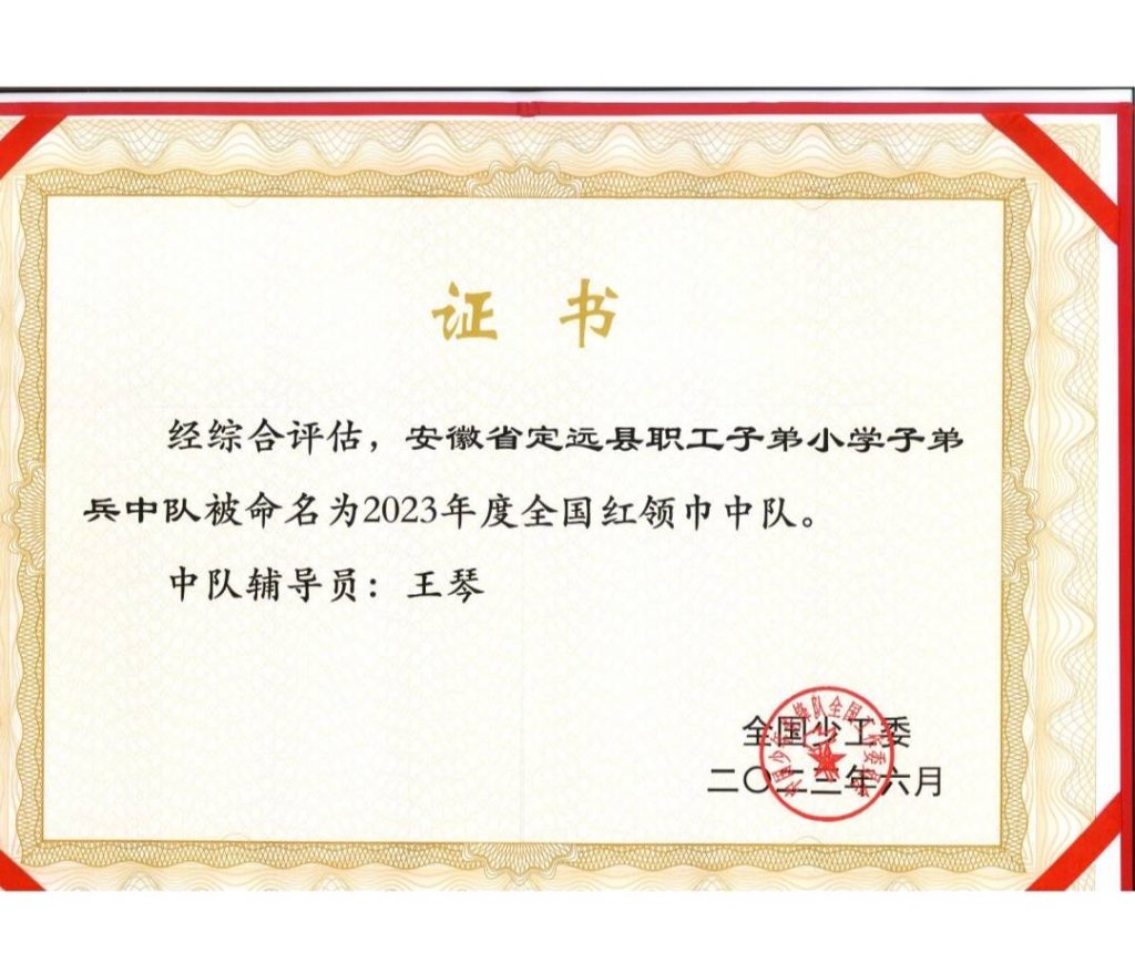 ~ 为持续高质量推进四红党建品牌创建,职工子弟小学加强了红色阵地建设,努力打造了少先队红色育人队伍。在创建过程中,学校新建了全县一流的少先队队室,申报了四红党建特色品牌推动少先队工作省级课题并成功立项。2023年上半年,在学校四红党建品牌引领下,少先队积极开展四红实践教育活动和理论研究并有意打造优秀中队,六月份,经过全国少工委综合评估考察定远县职工子弟小学子弟兵中队荣获2023年度全国红领巾中队称号。2023年10月,由学校年轻党员教师张玉主创设计的少先队红色队课在滁州市少先队活动优质课大赛中荣获一等奖。
