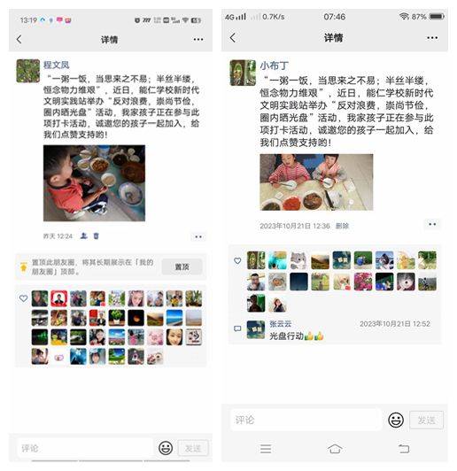 ~ 此次活动分为两部分进行,一是由家长上传自己孩子“光盘行动”的照片至微信朋友圈,并集满18个赞,通过线上打卡,进一步扩大宣传,让更多的同学参与其中,增强节约意识、环保意识和责任意识,将勤俭节约之风传承下去。