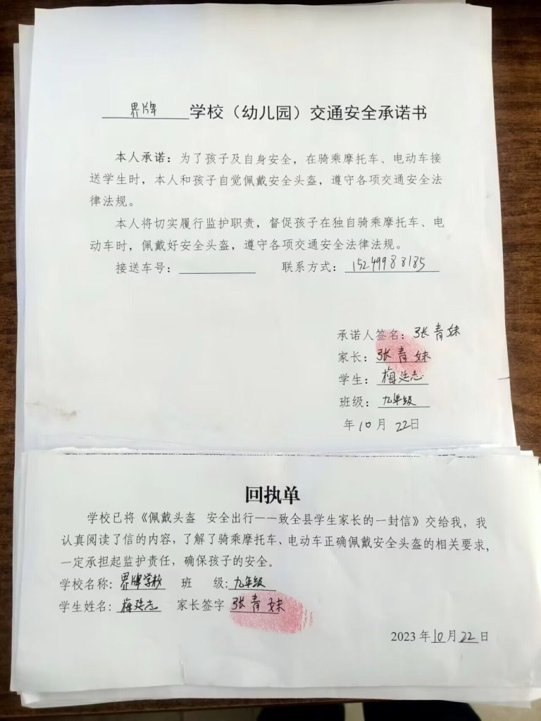 ~ 另外,为使宣传教育活动起到实效,该校还与学生家长签订了交通安全承诺书。还在上下学期间,组织护学岗教师及门卫劝导接送孩子的家长正确佩戴头盔,将电瓶车有序停放在安全区域。