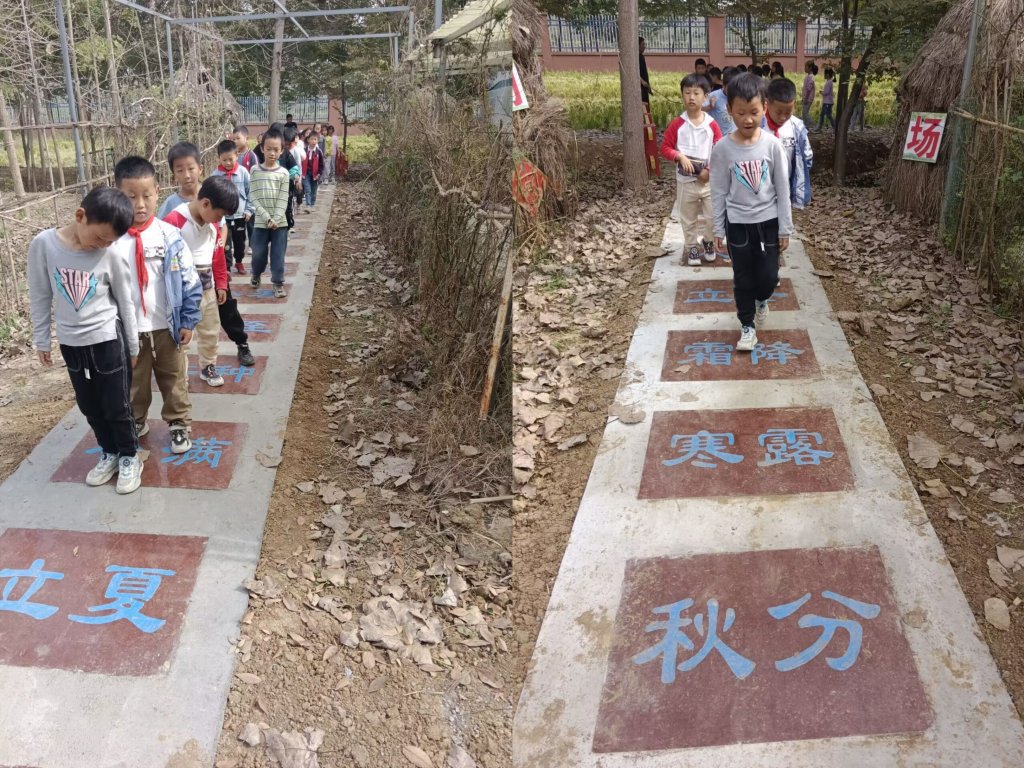 ~ 观看稻子收割结束,孩子们又来到了学校劳动教育文化小景之一——“走过四季”之“二十四节气”路。了解二十四节气的由来及每个节气的特点。感受到中国古代劳动人民的智慧及辛劳。