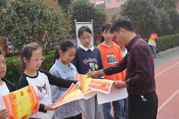 ~ 少先大队辅导员主持颁奖仪式并宣布表彰名单。在掌声和欢呼声中,获奖的学生们依次登台领奖,学校领导分别为获奖同学颁发奖状以及属于他们的特色奖章。领奖台上,获奖的同学举着奖状和奖章,脸上洋溢着喜悦与骄傲。