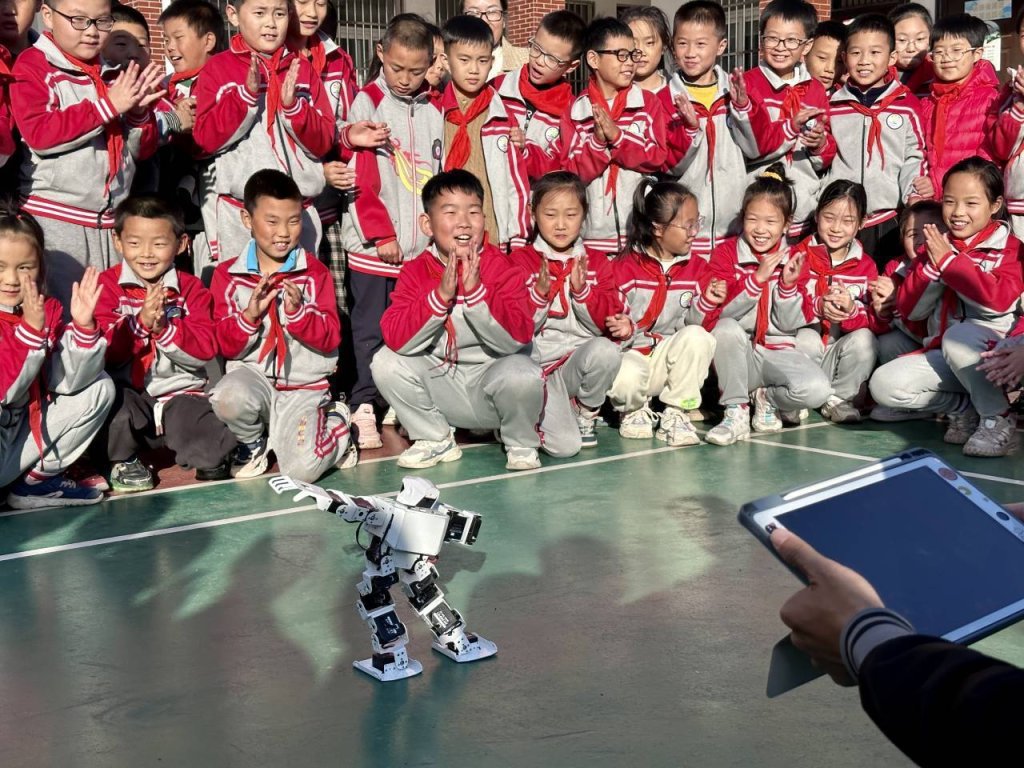 ~ 在机器人科普课上,机器人伴着音乐节奏翩翩起舞,动作流畅灵活,给同学们展示了蹲下、转身、拜年等多维度肢体动作,引发阵阵喝彩。