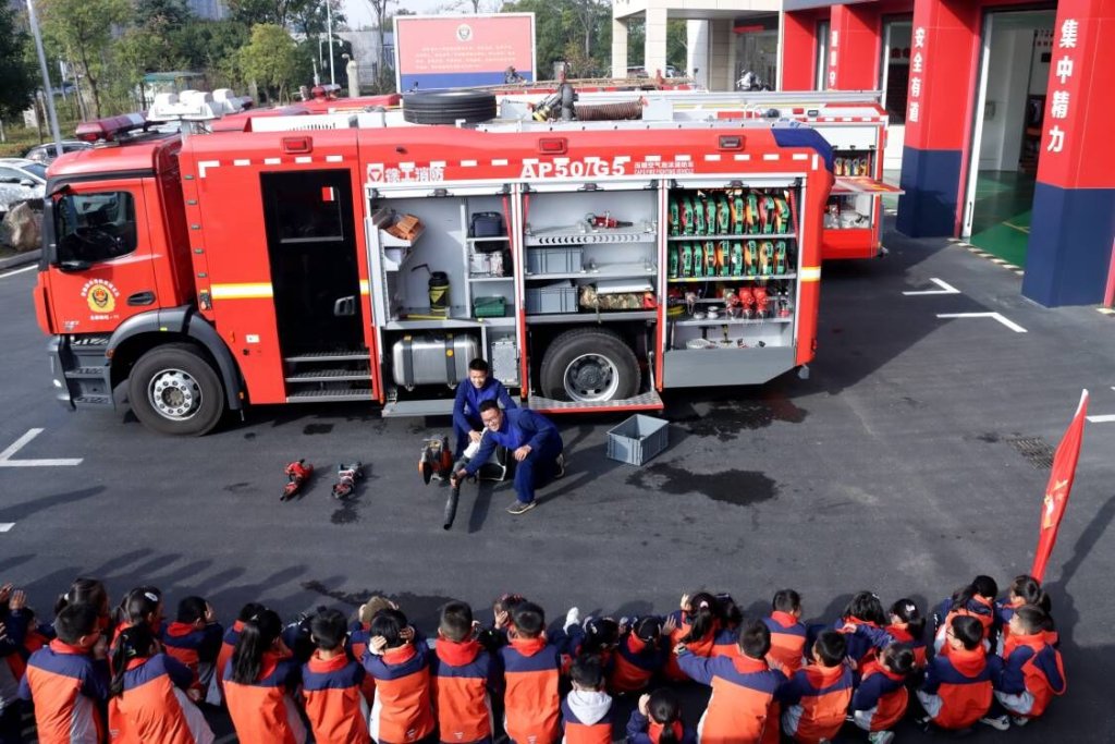~ 第一次近距离观察消防车,同学们好奇和欣喜之情溢于言表,消防救援队员用通俗易懂、幽默诙谐的语言一一向同学们介绍了消防车、消防救援器具等,讲解了其用途和使用方法,还让学生亲身体验操作消防救援器械。消防救援队员向同学们展示了不同情况下的不同的消防服装,并邀请同学进行试穿感受。面对从未接触过的消防车以及消防救援知识,同学们展现出了浓厚的兴趣,在倾听讲解的同时,还不时亲自动手去感受消防救援工具带来的新奇感,同时虚心地向消防救援队员请教心中的问题。