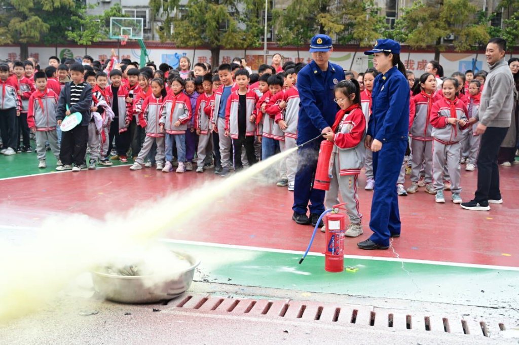 ~ 曲阳路校区操场上,县消防救援大队宣讲员从日常生活细节入题,围绕楼道、楼梯间、门厅里不能停放电动车,电动车要在指定的集中充电地点充电,不要在床上给手机充电等消防安全知识进行宣传;指导学生在面对火情紧急撤离时,要有序地疾走行进,下楼时要沿墙体右侧成单排纵队往下行。灭火培训环节中,在消防队员手把手的指导下,部分学生使用瓶装干粉灭火器对燃烧物进行灭火演示;在消防队员协助下,学生代表还体验了使用水枪等消防装备进行灭火操作。灭火培训间隙,消防救援大队人员还在学生中发放了《安全常识教育》读本,对学生进行安全常识教育。