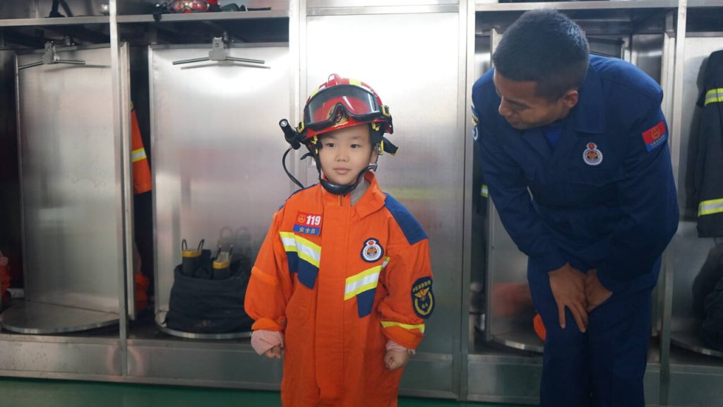 ~ 一走进消防救援大队,同学们就被威武的消防车辆和各种消防救援器材所吸引。在县救援大队宣传办主任的带领下,同学们参观了消防器材、执勤车辆、个人防护装备,消防员向大家详细讲解了车辆、装备器材的性能、功能及用途。为满足同学们的好奇心,消防员热情地邀请他们试穿“消防战斗服”,零距离接触感受各类器材,让同学们真真实实过足了一把“消防瘾”,圆了“消防梦”。