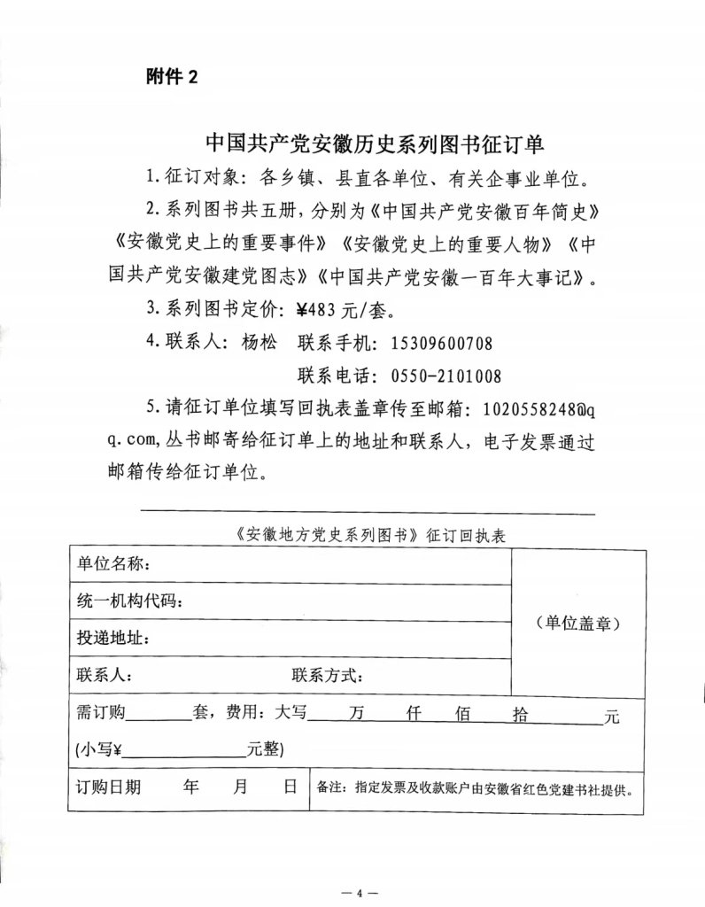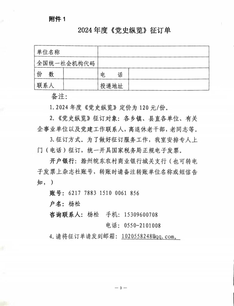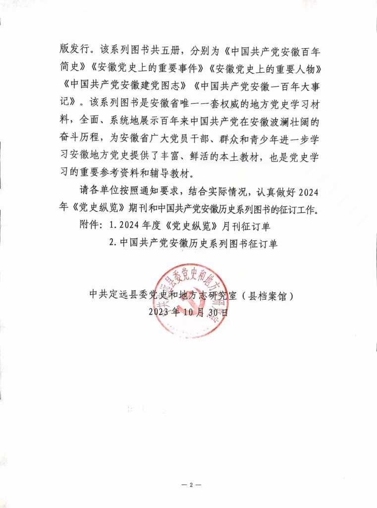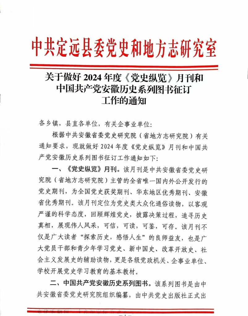 根据中共安徽省委党史研究院(省地方志研究院)有关 通知要求,现就做好 2024 年度《党史纵览》月刊和中国共产党安徽历史系列图书征订工作通知如下: