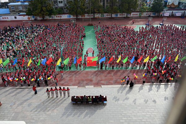 ~ 曲阳路校区的操场上,32名少先队员手持五彩缤纷的氢气球一字排开,面向主席台站定。在32名少先队员高举彩旗所组成的彩旗方队的引导下,少先队员高擎国旗、校旗,肩扛校徽入场,在操场中央挺立。彩旗队队员分列操场前排,与气球队队员共同组成运动员入场通道。伴着运动员入场曲,2915名学生以班级为单位组成59个方队,在老师的带领下挥舞国旗、花环、充气棒等,喊着具有班级特色的嘹亮口号入场。深秋的操场,彩旗招展、领巾飘扬。