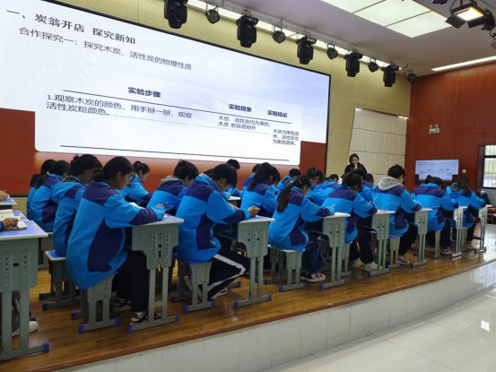 ~ 活动第一项是公开课展演。第1节课是来自定远县双塘中学的雷蕾老师带来的初中化学第六单元第1课时《碳的单质》。雷蕾老师以“卖炭翁”为主线,巧妙设计,从导入到新知,再到总结提升,环环相扣。卖炭翁开店,商品是碳,碳商品不断提升,教学知识点不断出现。结合课内外相关实验和生活经验系统、明晰地展示了碳单质的有关知识点。从木炭、活性炭、炭黑、焦炭,石墨,金刚石,再到C60、石墨烯等等。在总结提升环节,雷蕾老师巧妙设计了《卖炭翁新传》,模仿《卖炭翁》,以诗句形式概括了本课时主要知识点。最后,雷老师利用“碳单质以不同的形式发挥作用,贡献人类”的科学内容,激发学生积极向上,为社会做贡献,体现个人价值的人生价值导向。