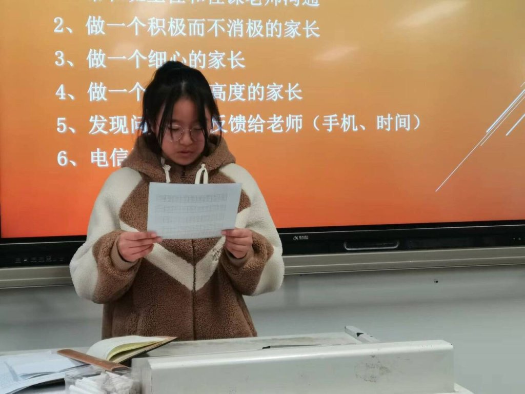 ~ 在第二议程的班级家长会上,各班班主任立足班情,从班级管理、班级事务、学生行为习惯、学习习惯、品质发展、教学成绩等多方面向家长进行反馈与沟通,让家长们对孩子与班级更加清晰、全面的认识。有的班级安排了优秀学生代表发言,分享自己的学习心得。他们总结了很多有效学习的小法和技巧和大家共勉。他们纷纷表达了对老师和父母的真挚感恩,并表示自己会不断勤奋学习,报答老师和父母的辛勤付出。