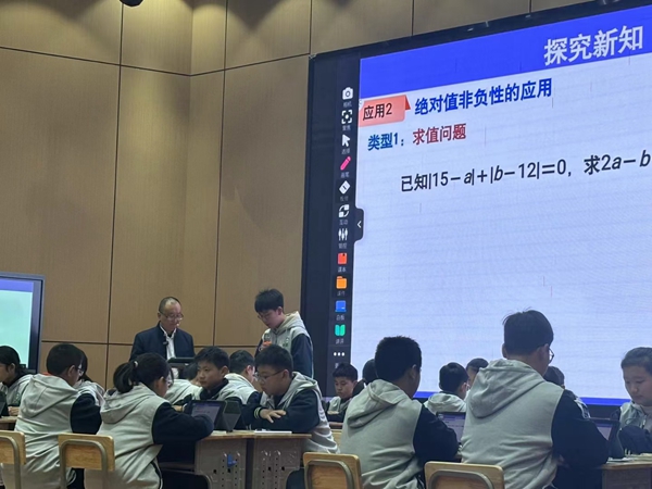 ~ 定远县第一初级中学数学组骨干教师王吉桥老师执教七年级数学《绝对值的综合应用》。通过现场观摩课的方式展示智慧课堂上课,淋漓尽致地展现了智慧课堂中“全班作答、线上讨论、随机点人、连线”等互动工具的潜在优势,精彩上演了一场“高频互动+高效实用”的信息化课堂教学。课后进行了智慧课堂应用经验交流。