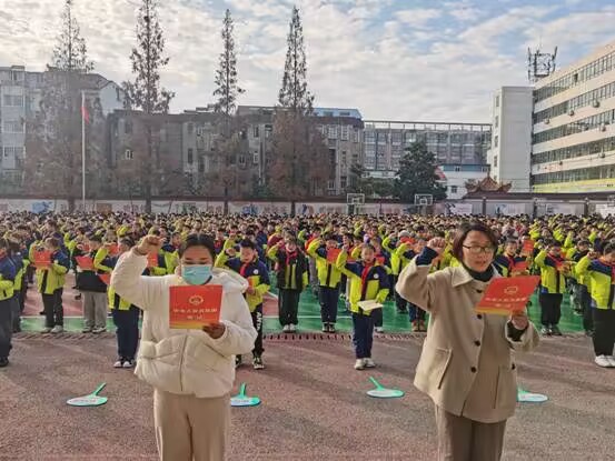 ~ 曲阳路校区操场上,集团学校2023年“宪法宣传周”启动仪式在此举行。在老师的带领下,2915名学生踔厉奋发、列队整齐。“宪法日国旗下讲话”活动中,少先队员代表以宪法的概念入题,深入阐释了《宪法》是我国根本大法的法律地位;就《宪法》的法律效力、法律权威进行说明。“国旗下讲话”上,大队辅导员还就深入学习宪法、严格遵守宪法、积极维护宪法、大力宣传宪法等向全体学生发出倡议、提出要求。政教部门成员还在师生中发放了宪法宣传材料,指导师生熟读宪法宣誓誓词,并带领师生进行了宪法宣誓。随后,由少先队员们带来的手势舞表演《做守法小卫士》把启动仪式推向高潮。