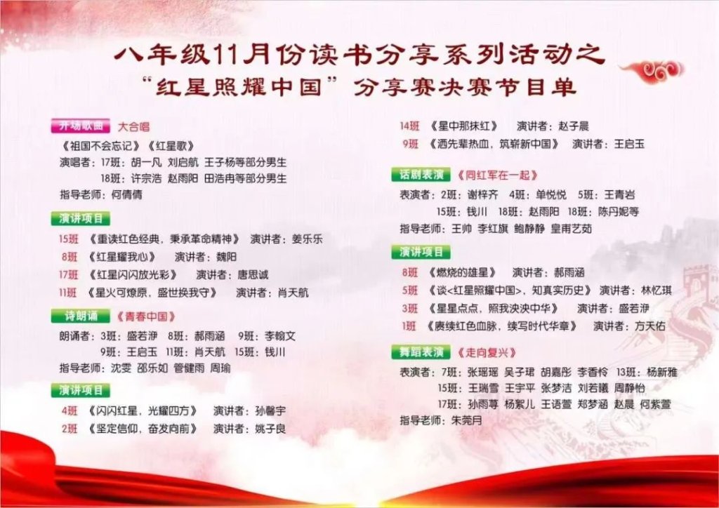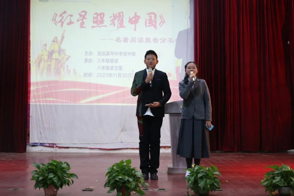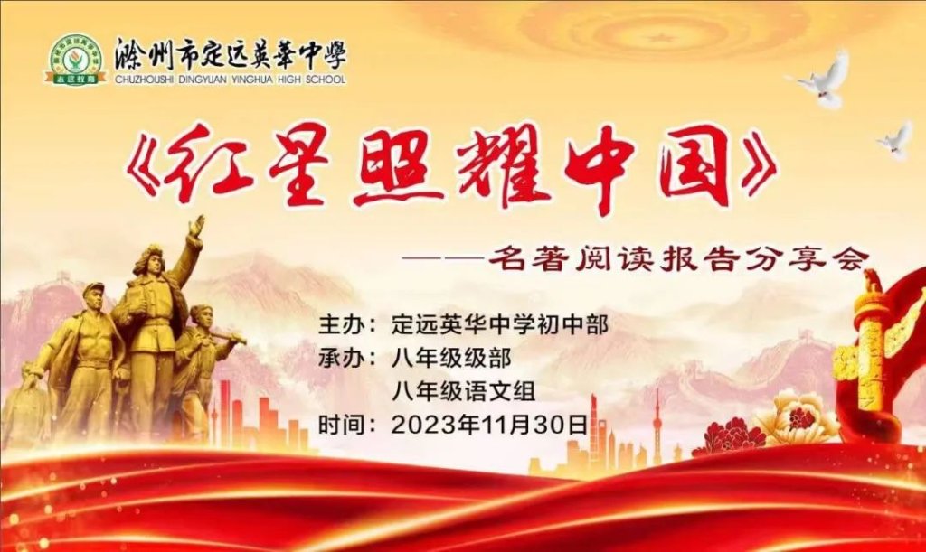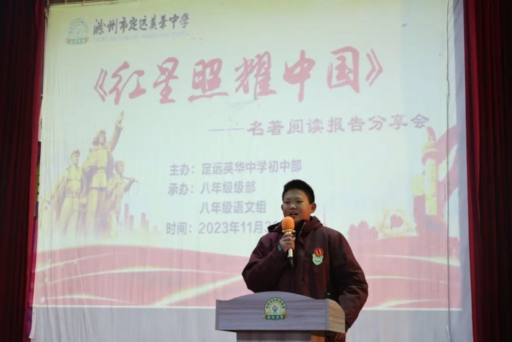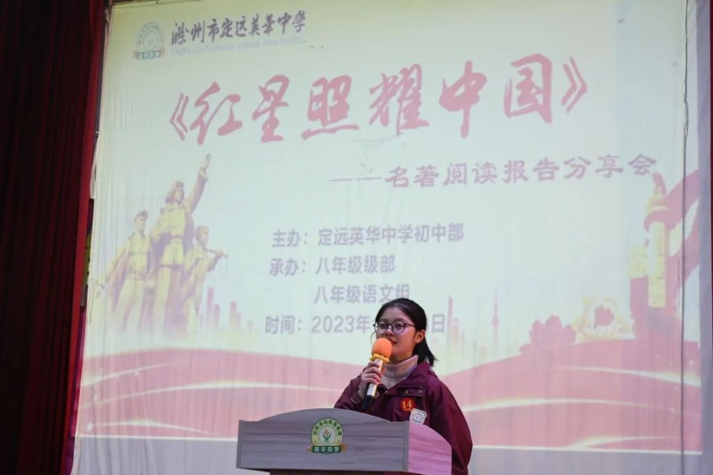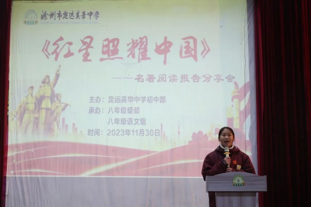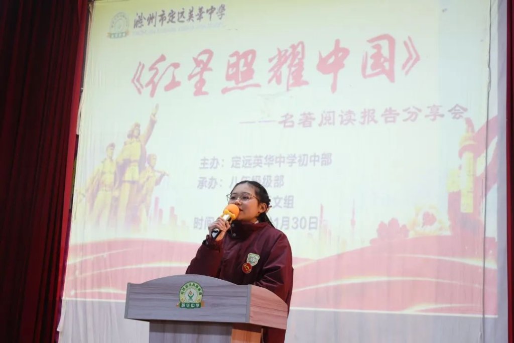 ~ “愿以寸心寄华夏,且将岁月赠山河。”作为新时代青少年,爱党爱国是每一个青年的责任与义务。为了培养、弘扬爱国主义精神,让英华心根教育和语文核心素养生根开花,11月30日晚,滁州市定远英华中学八年级在三号报告厅组织开展了《红星照耀中国》名著阅读分享赛活动。