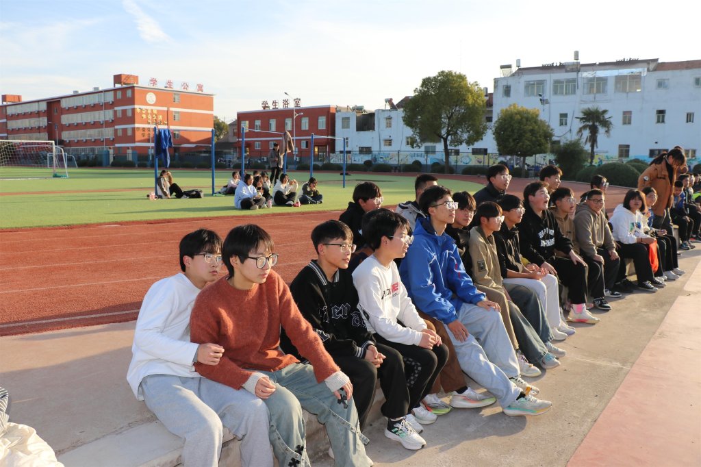 ~ 各班组织拉拉队给篮球运动员加油鼓劲,即使赛场上没有自己,他们也在后面全力为队员做好后勤服务,呐喊着“加油”为他们助威。(图文:李发宝 初审:黄祎 审签:欧健海)