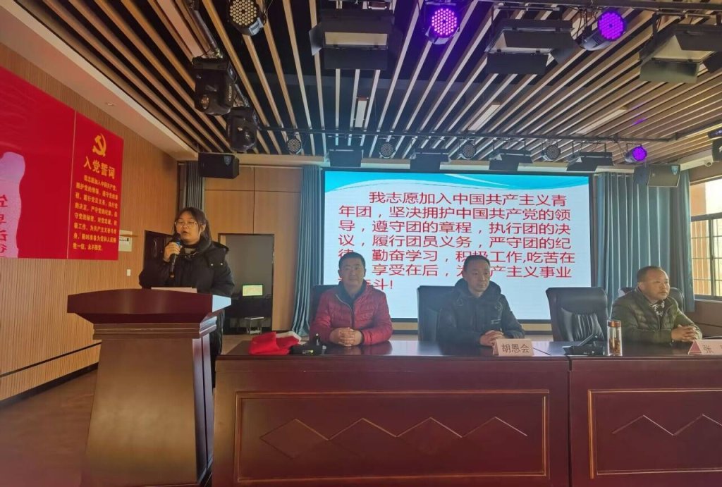 ~ 首先,由校团委书记胡家会宣读了新团员名单,本次共有八名同学光荣地加入了中国共产主义青年团。接着参会领导给新团员佩戴团徽并下发团员证。“我志愿加入中国共产主义青年团,坚决拥护中国共产党的领导”,在蔡梅玲同学的带领下,大家庄严宣誓,铿锵有力的誓词激荡着每一位同学的心。蔡梅玲同学发表新团员讲话表示,始终记住团员的责任,做同学们的楷模刻苦学习。入团介绍人杨老师勉励同学们不忘初心,争做栋梁之才。