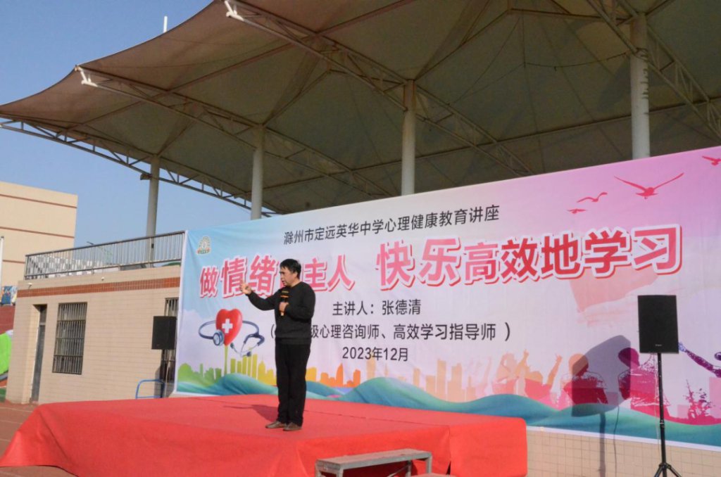 ~ 2023年12月7日13时35分,一场由张德清教授主讲的高中心理健康讲座在滁州市定远英华中学校园内成功举行。张德清教授是国家三级心理咨询师、高效学习指导师,拥有丰富的专业知识和实践经验。