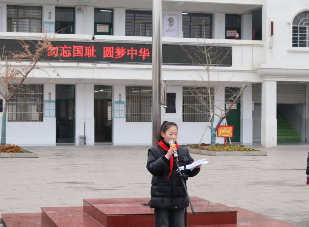 ~ 上午,寒风凛冽,学校师生齐聚操场,举行了“勿忘国耻 圆梦中华”主题升旗仪式。全体师生在冉冉升起的国旗下齐唱中华人民共和国国歌,四年级的队员作了《勿忘国耻 振兴中华》的国旗下讲话。讲话结束,大队辅导员李月老师为全体队员们讲述了南京大屠杀的历史和设立国家公祭日的意义,号召同学们不忘昨日的苦难,珍惜今天的幸福生活,练就扎实本领,为实现中华民族伟大复兴的中国梦不懈奋斗。