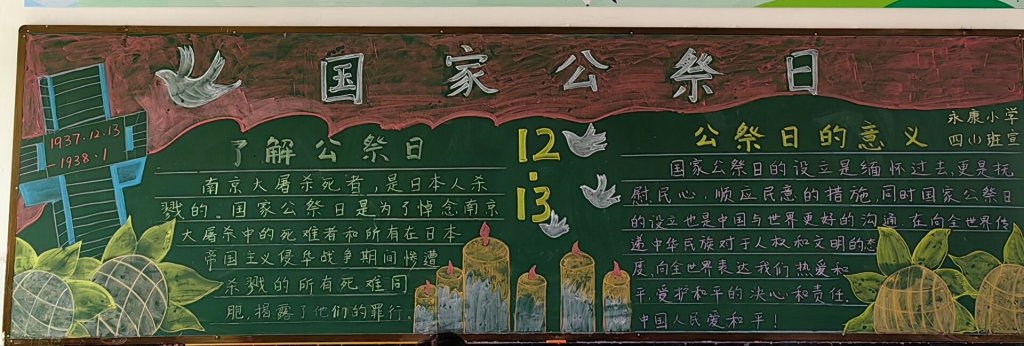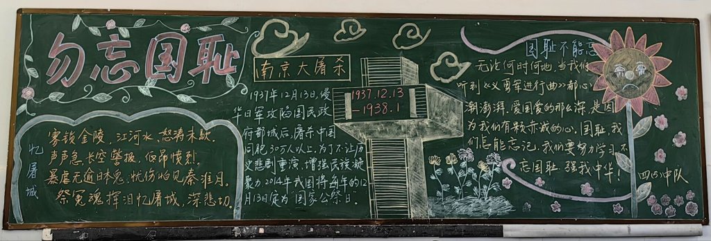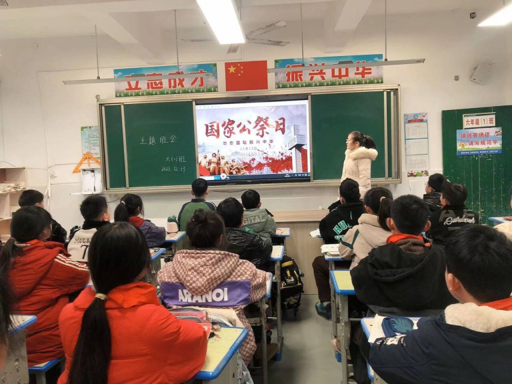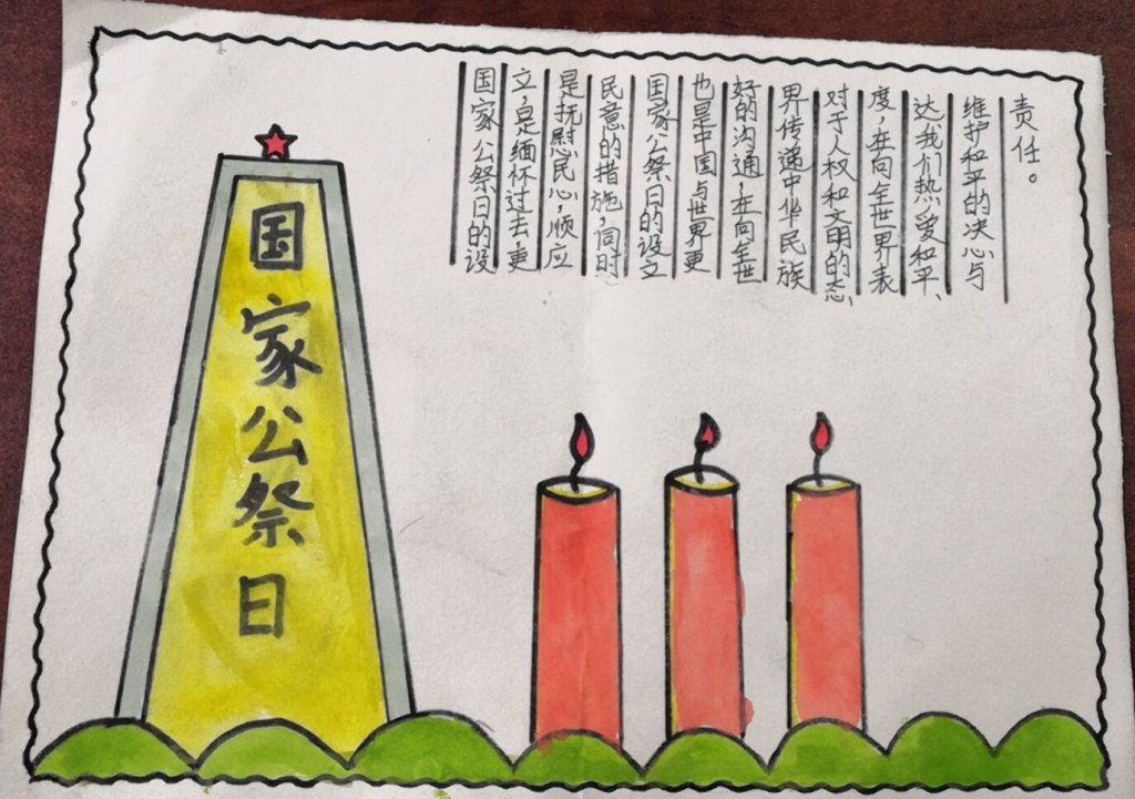 ~ 仪式结束后,各班在班级组织“勿忘国耻,吾辈自强”主题班会和网上公祭活动。利用班级黑板报让学生深刻感受到历史的沉痛,为遇难的同胞默哀,也自我警示,奋发拼搏。明德校区各中队辅导员组织学生通过观看视频、史料介绍、讲爱国故事等形式,引领同学们以写心得、做记忆卡片的方式让队员们铭记了那段沉痛屈辱的历史。