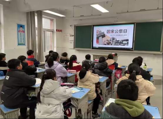 ~ 首先,师生齐唱国歌并默哀一分钟,表达了对在南京大屠杀以及世界反法西斯战争中遇难同胞和英烈的深切哀悼和缅怀,接着老师们利用多媒体课件讲解了“国家公祭日”的由来、日本侵略者在南京犯下的滔天罪行等。通过观看纪录片、自制白花默哀追思、吟诵公祭铭文等方式,加强爱党爱国教育。