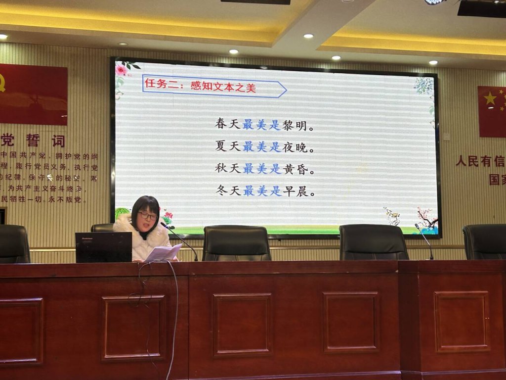 实验小学教师陈华丽作为主备人,介绍了备课相关情况和教学设计。陈华丽从学情分析、教材解读、目标设置、方法运用和设计思路等方面详细阐述了《四季之美》这一课的教学设计。陈老师的教学设计结合课件,在践行新课标的背景下,积极渗透了大单元教学和任务群意识。