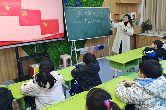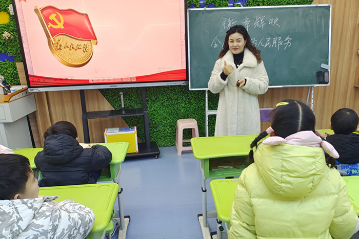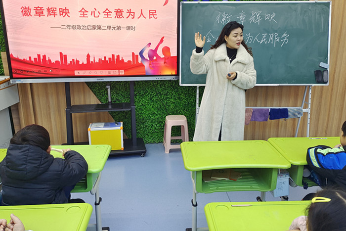 ~ “思政课是落实立德树人根本任务的关键课程。”在培养担当民族复兴大任的时代新人这一历史使命中,思政课发挥着“压舱石”作用。滁州市永乐小学党总支高度重视思政课程建设,为深入学习贯彻党的二十大精神,推动党的创新理论进课堂,12月22日,滁州市永乐小学党总支书记姚杰以《徽章辉映  全心全意为人民服务》为主题,为孩子们上了一节生动精彩的思政课。