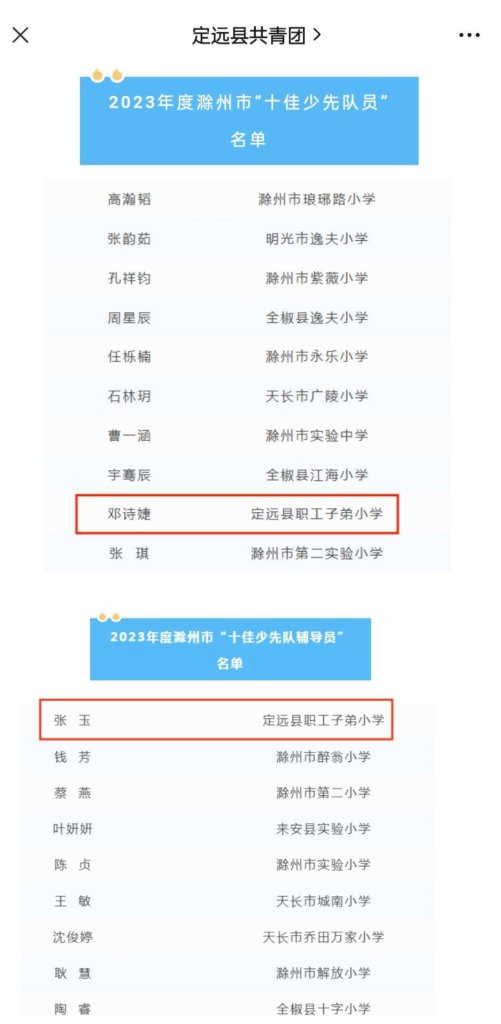 ~ 近年来,定远县职工子弟小学党支部自开展党建引领,打造四红特色品牌工作以来,在做好党员学习和教育的同时,积极打造学校少先队四红特色工作,在创建过程中,依托红色园丁,红色课堂,红色阵地,红色实践开展了一系列的红色主题教育活动,取得了一系列喜人成果。2023年4月,安徽省少先队工作专项课题《党建引领,打造四红特色品牌,加强少先队爱国主义实践研究》在职工子弟小学成功立项并顺利开题。2023年9月,职工子弟小学子弟兵中队被授予全国红领巾中队称号。2023年12月,职工子弟小学五年级邓诗婕同学和张玉老师又分别荣获滁州市十佳优秀少先队员和十佳优秀辅导员称号。