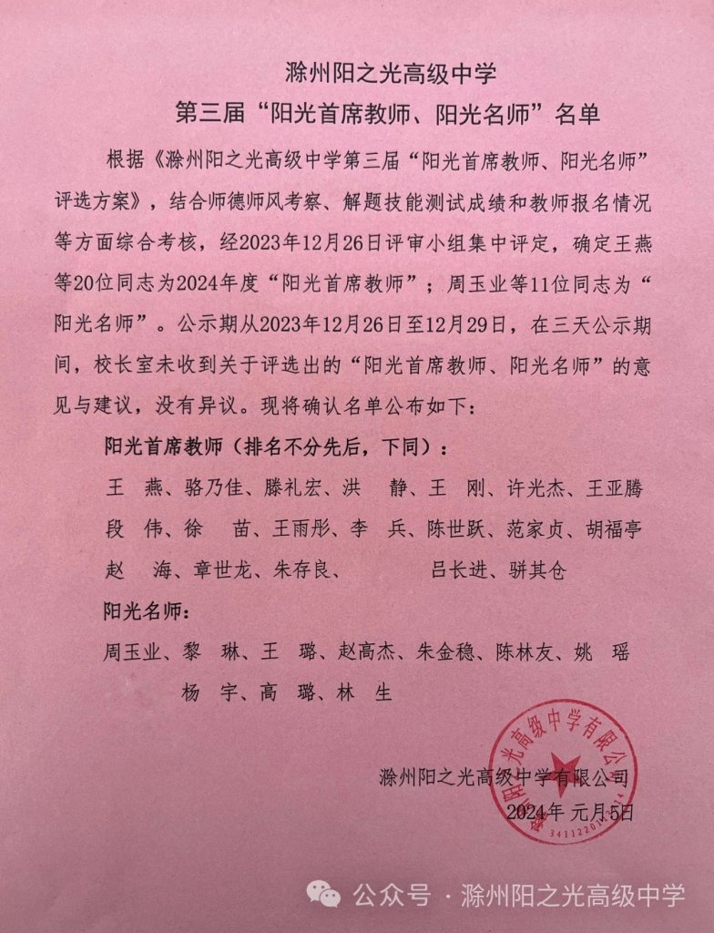 ~ 为了充分调动教师的教学积极性,鼓励教师积极投身教学工作,探索教学改革,提升教师队伍整体素质,促进教育教学质量的提升,表彰先进,体现优劳优酬,经校长室研究决定,滁州阳之光高级中学继续开展第三届“阳光首席教师”、“阳光名师”评选活动。