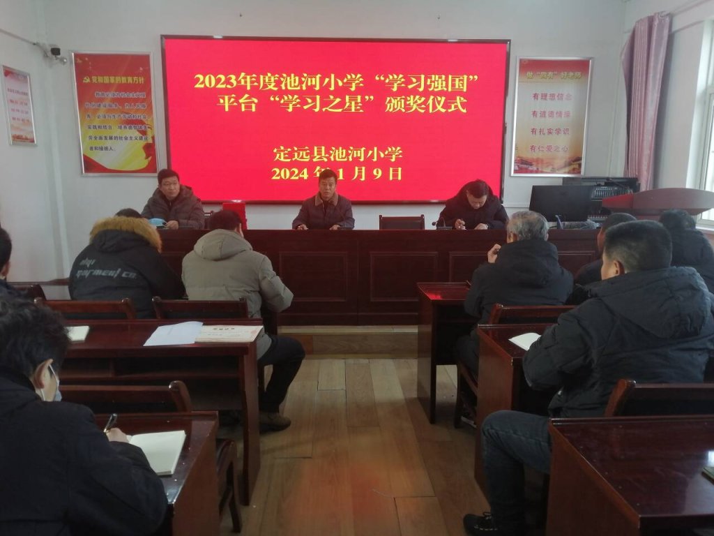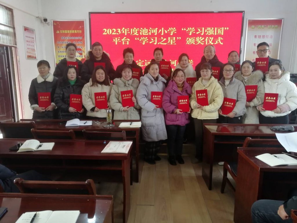 ~ 2024年元月9日上午,定远县池河小学在大会议室隆重举行2023年度“学习强国”平台上积分突出、成绩显著的“学习之星”表彰活动。学校党支部书记、校长李四军向26名“学习之星”颁发了证书和奖品,鼓励他们珍惜荣誉,继续发挥先进典型示范作用。