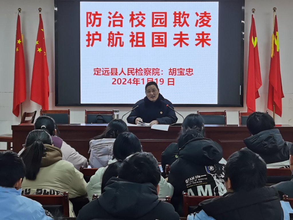 ~ 胡宝忠同志是定远县人民检察院检察官,是范岗学校聘请的法治副校长。他从实际案例入手,用通俗易懂的语言,深入浅出地向同学们普及了防伤害、防欺凌等方面的知识。胡检察官教育学生要增强法治观念,要学会用法律武器保护自己的合法权益。