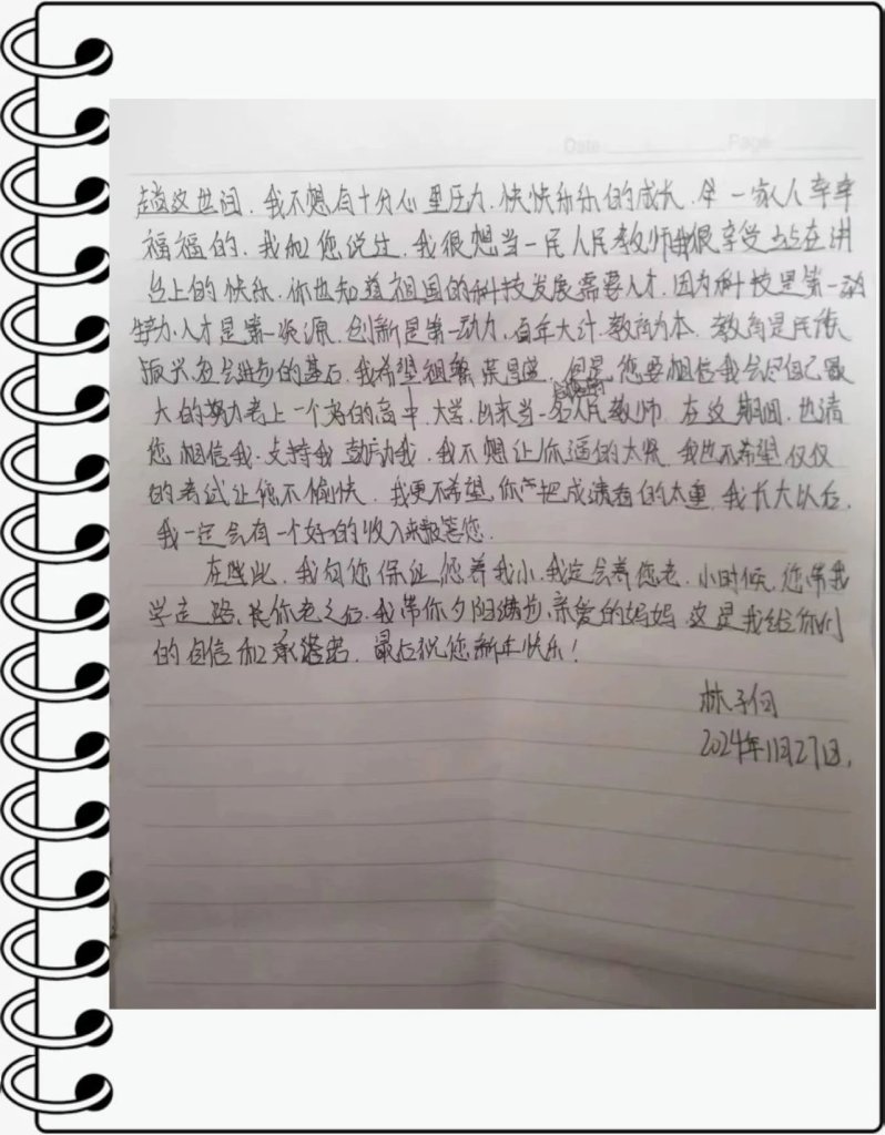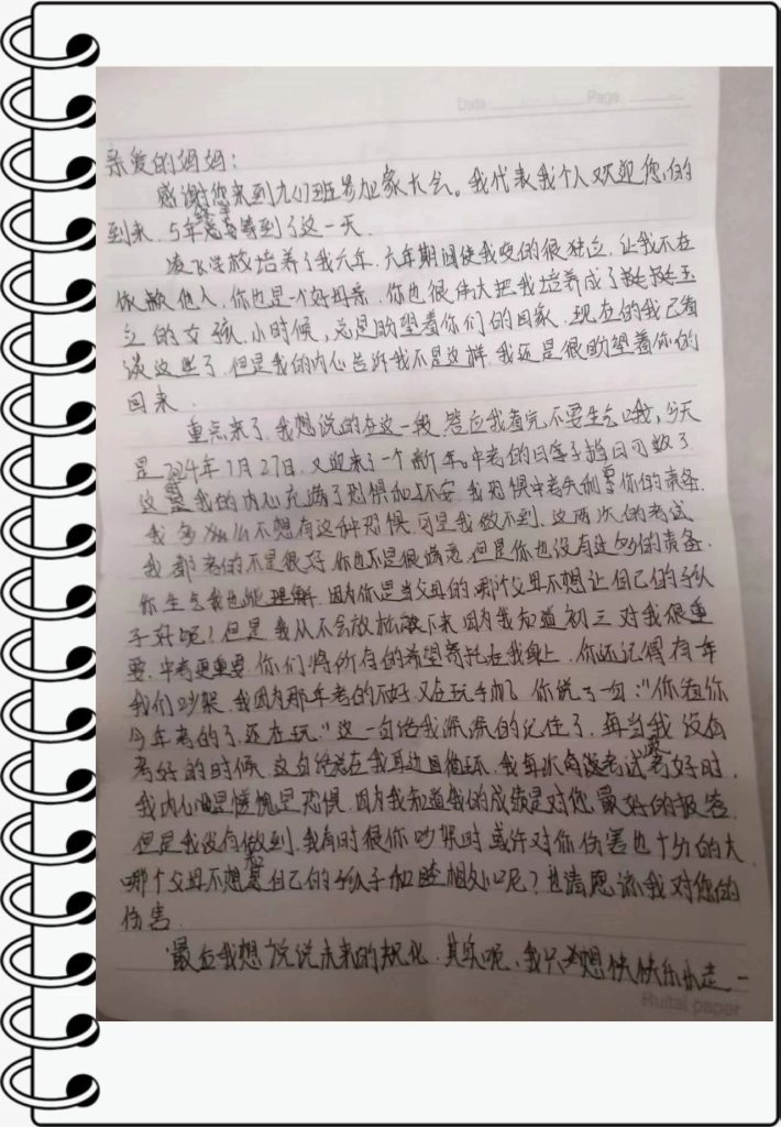 ~ 九(1)班 林子向同学的父母在江苏丹阳工作,为了参加女儿的家长会,凌晨3点开车从丹阳赶回定远,参加完家长会后,再驱车赶回丹阳。女儿很是感动,特意给妈妈写了一封信,孩子需要得到父母足够的关爱和支持才能建立安全感,让我们一起努力吧。