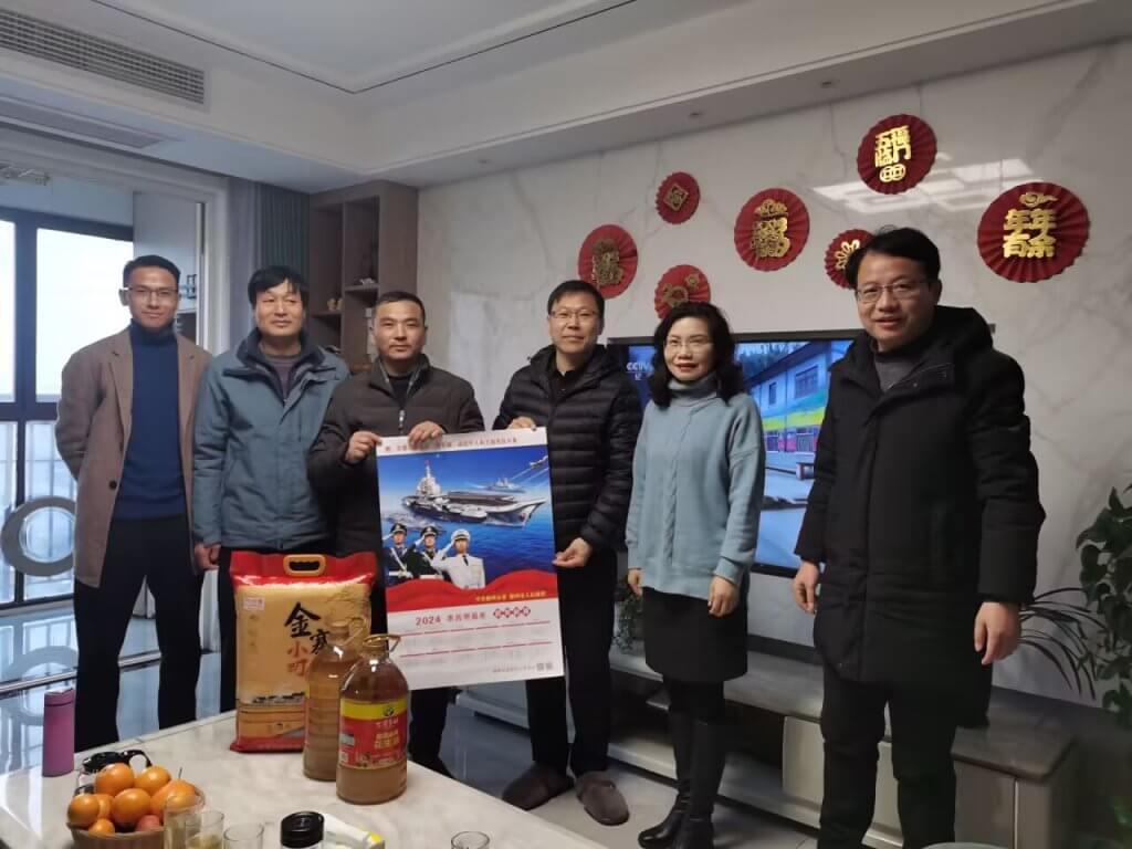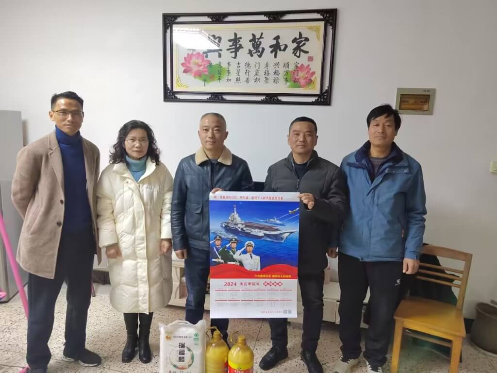 ~ 校党支部书记、校长张道胜等领导关切地询问了两位退伍军人家庭情况、身体状况。了解他们在日常生活中所遇到的困难及所想、所需、所盼,倾听他们的心声,感谢他们在各自的岗位上兢兢业业,任劳任怨,弘扬了部队的“好思想、好传统、好作风”为学校发展付出的努力,并为他送上新春祝福,送去米、油等慰问品。