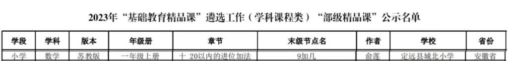 近日,教育部办公厅公布了2023年“基础教育精品课”部级精品课名单。定远县城北小学俞莲老师执教的数学课例《9加几》脱颖而出,成功入选教育部2023年“部级精品课”。这是对该校教学质量的肯定,也是城北小学教师团队深耕教研、推进课堂教学改革的成果展示。