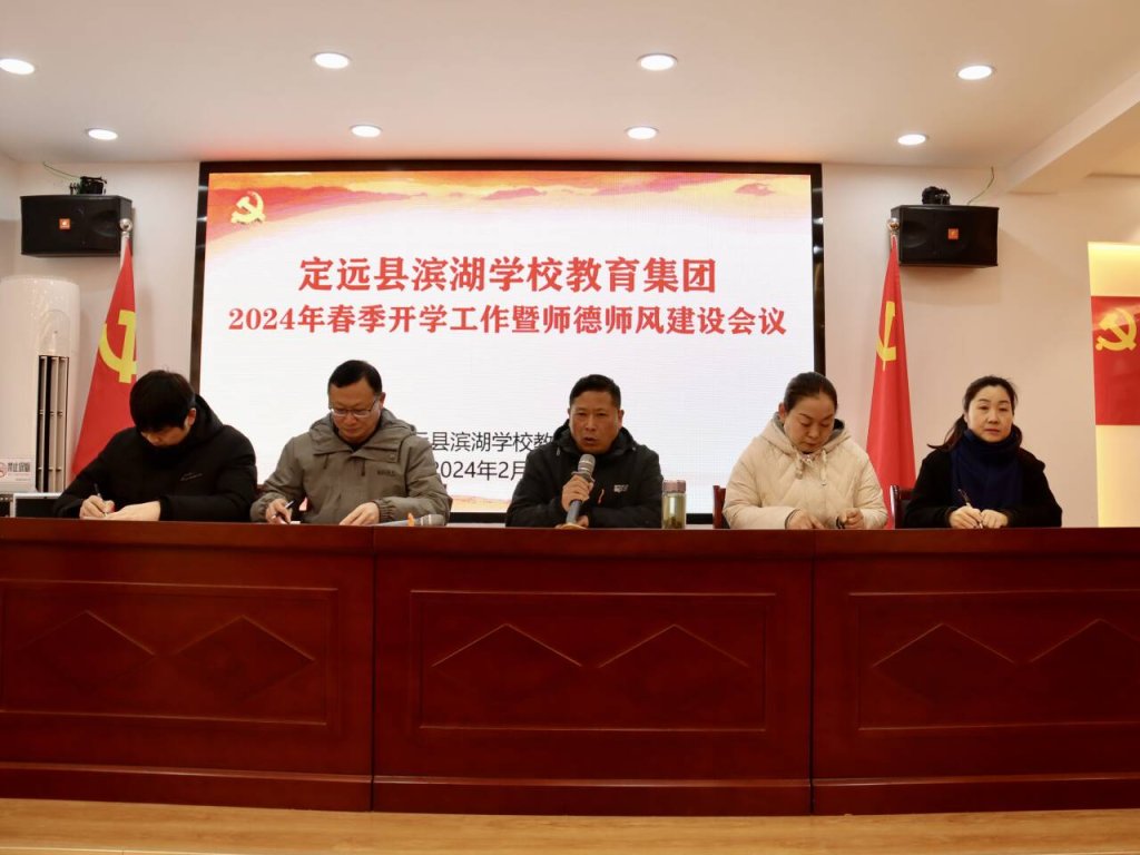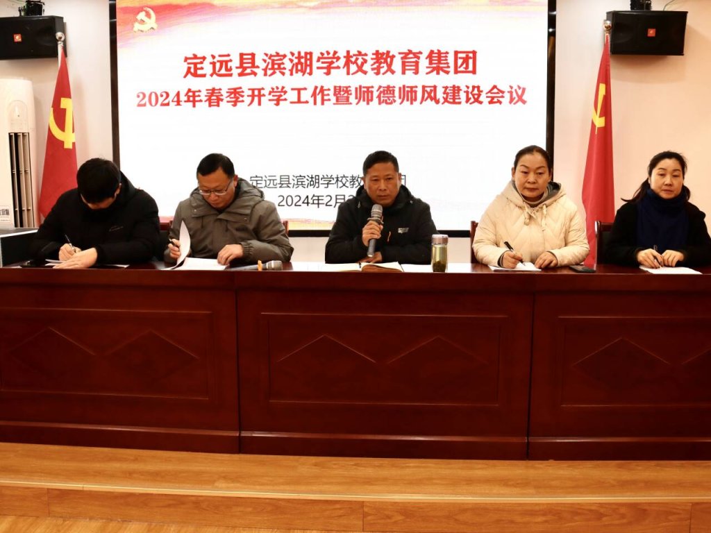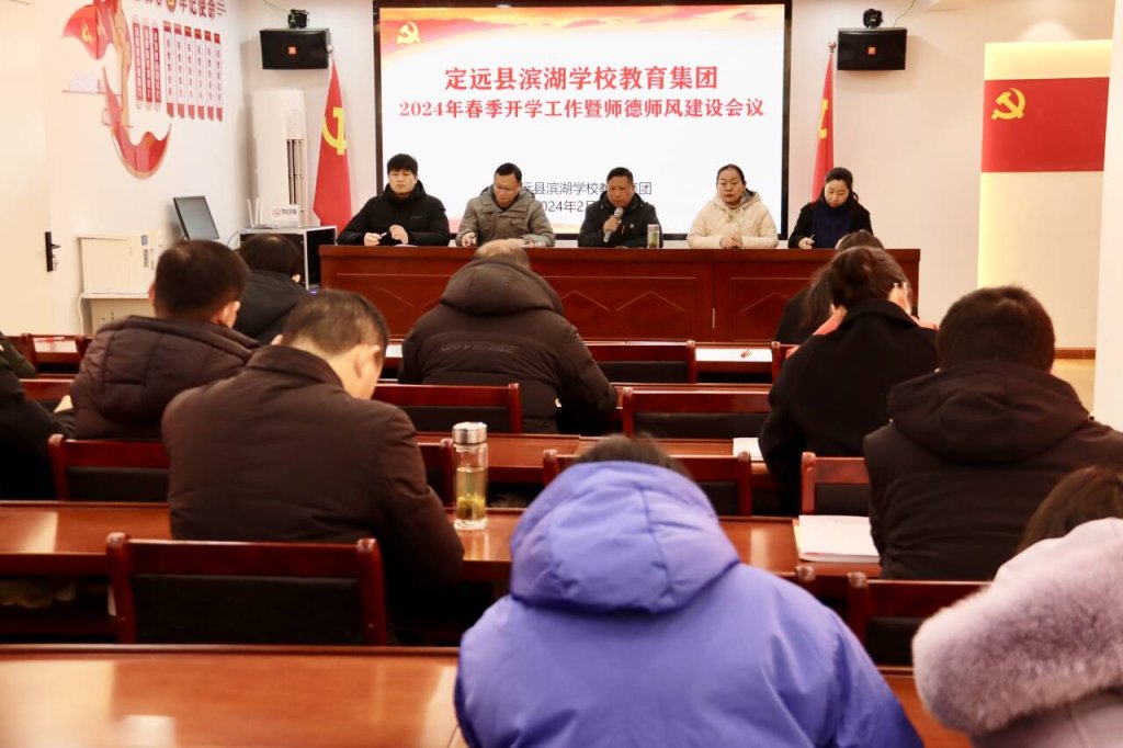 2024年2月21日上午,定远县滨湖学校教育集团在新区实验小学党建室隆重召开2024年春季开学工作暨师德师风会议。旨在为新学期的开学工作做好全面准备,并进一步强化师德师风建设,提升教育教学质量。滨湖学校教育集团校级干部、处室负责人参加会议。集团党支部书记李永书主持并讲话。