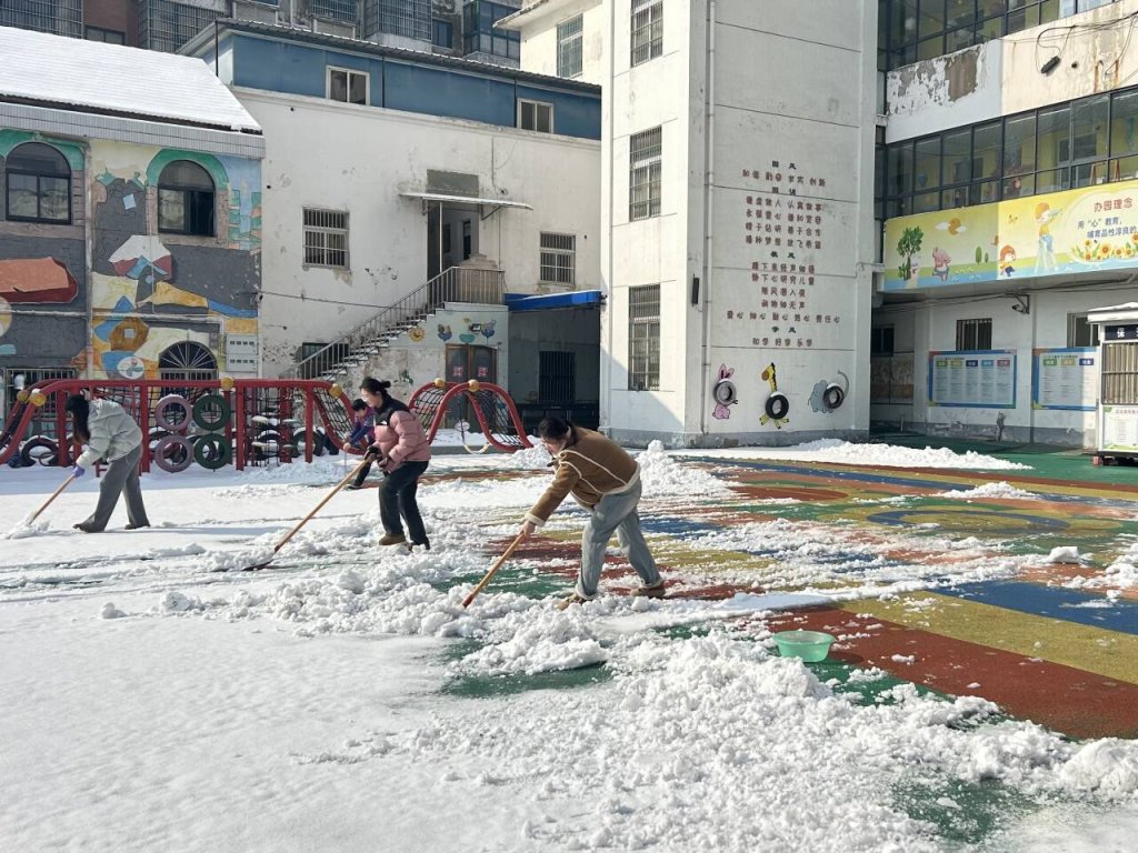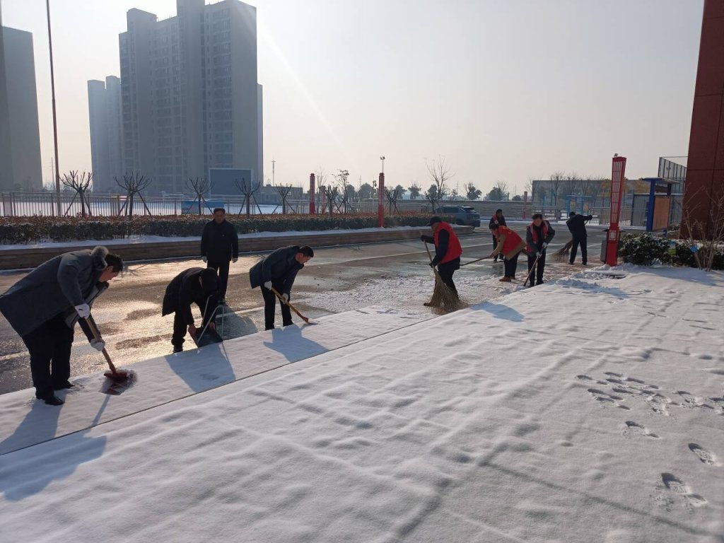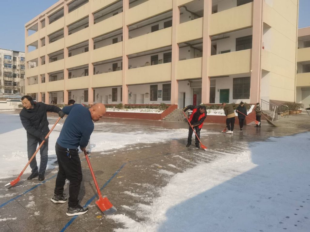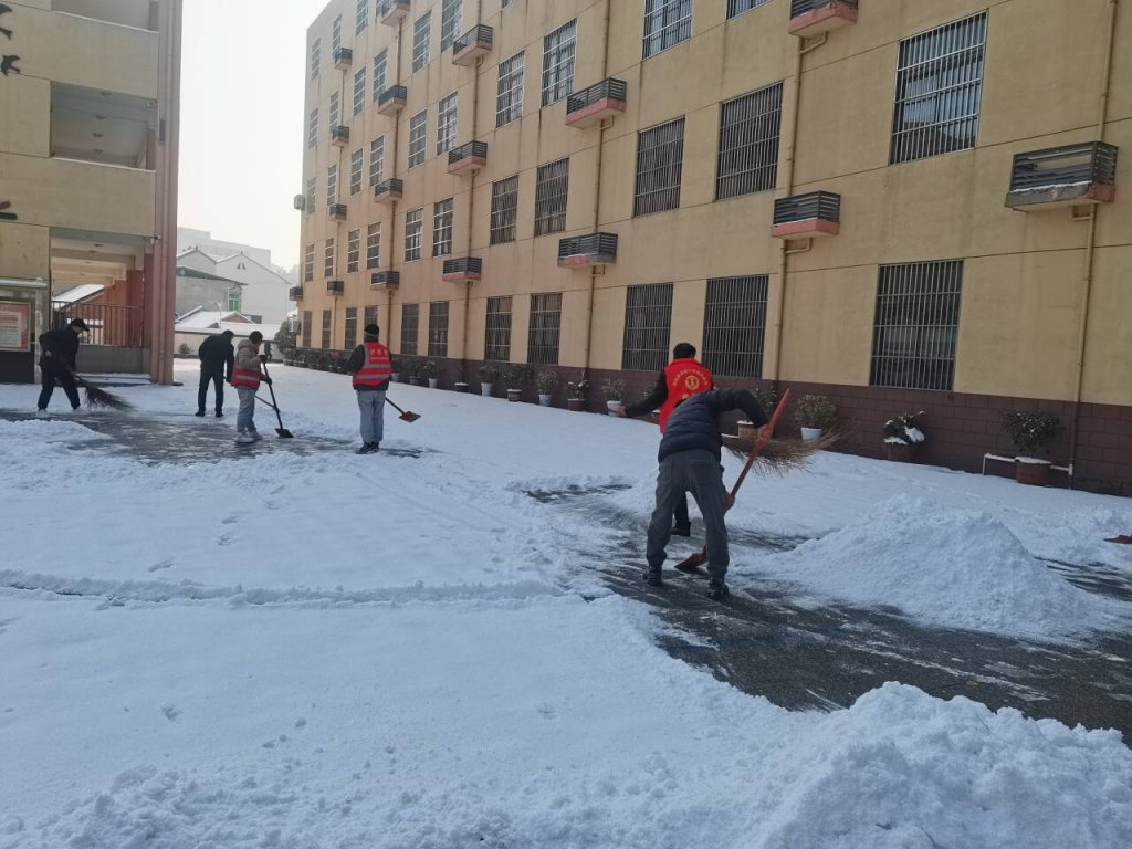 ~ 近日,2024年的一场大雪与新学期撞了个满怀,皑皑白雪带来极致美景的同时也给即将开学的校园带来了安全隐患。为积极应对雨雪冰冻天气,保障2月26日师生安全畅通入学,定远县实验小学教育集团党总支迅速组织各校区党员教师、中层干部和体育组男教师等组建了应对低温暴雪冰冻天气突击队,在2月25日清晨,走进校园,开展扫雪除冰活动。