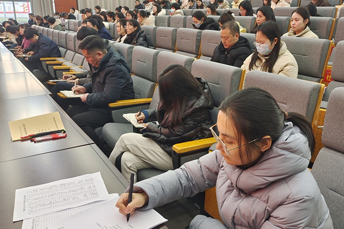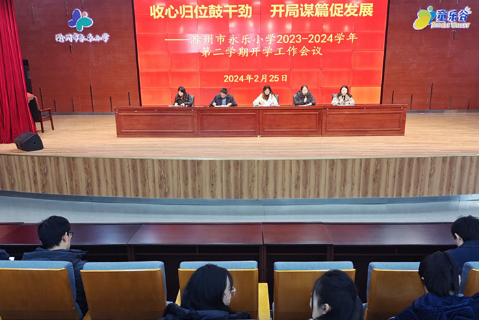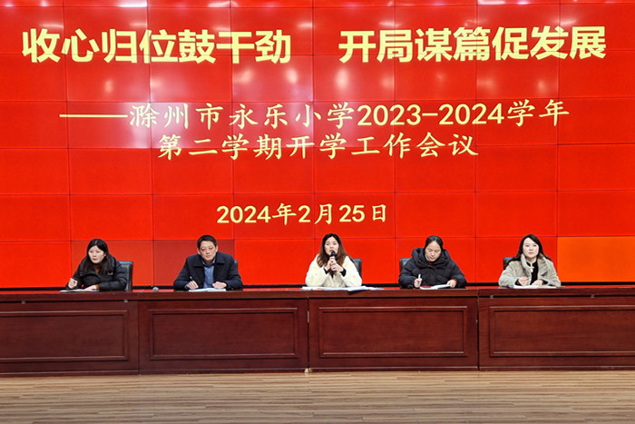 ~ 人勤春来早,万事在开头。为进一步谋划和布置新学期各项开学工作,2月25日,滁州市永乐小学在“童乐谷”剧场,召开了2023-2024学年第二学期全体教师开学工作会议,会议围绕“收心归位鼓干劲 开局谋篇促发展”这一主题,统筹安排了新学期相关工作,引领大家以昂扬的精神、积极的态度迎接新学期。