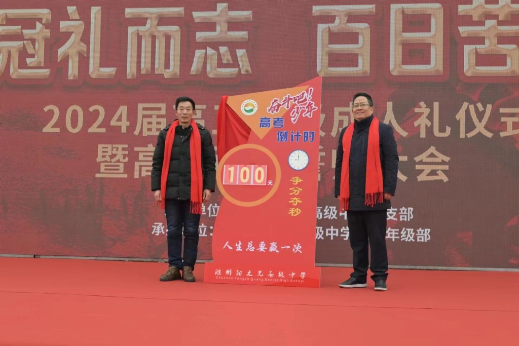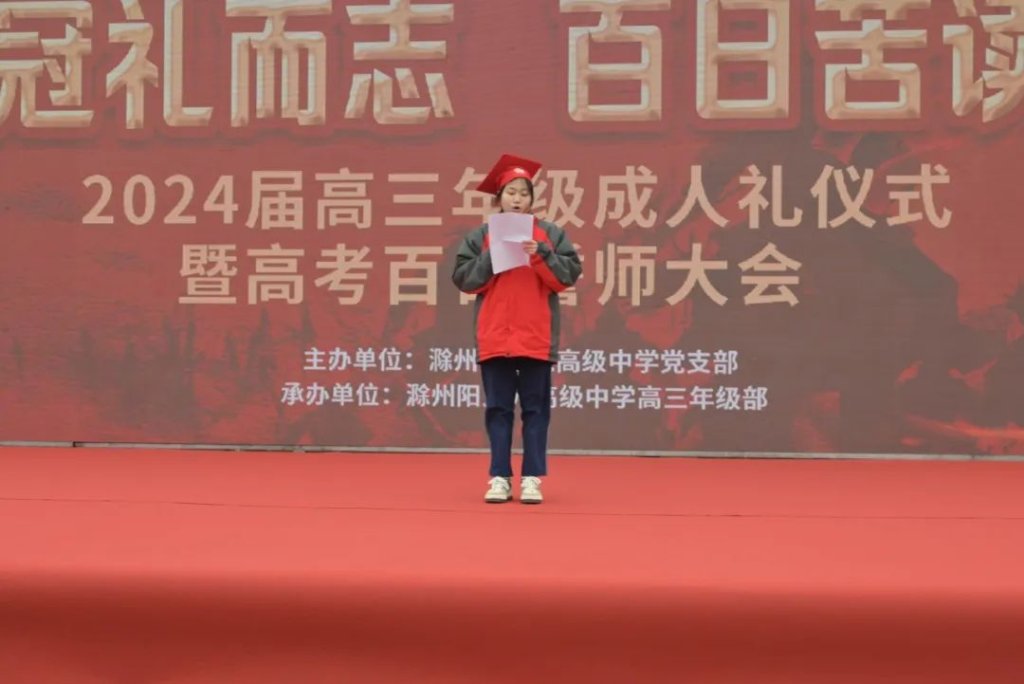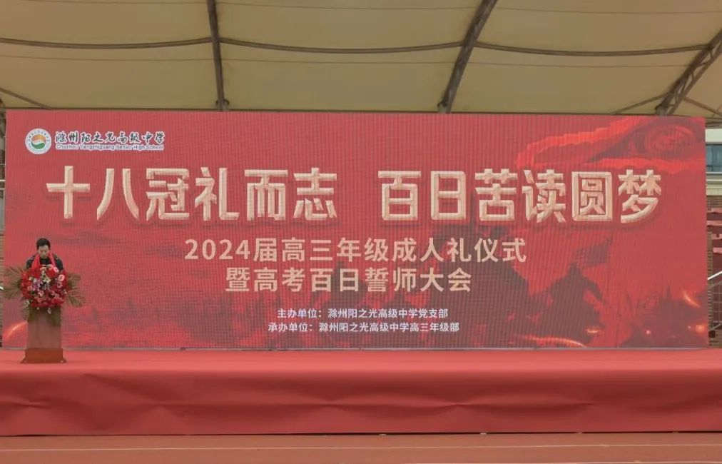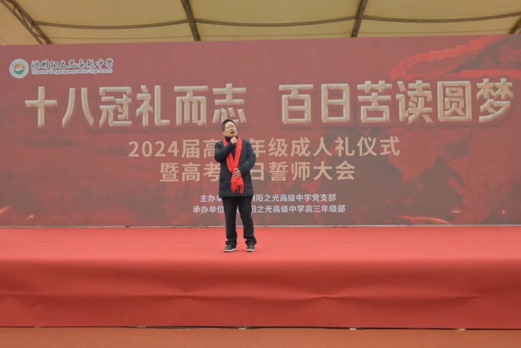 ~ 厚积十八载,扬帆踏浪向青云;圆梦一百天,振翮高翔破山河。在这个美丽的季节,我们欢聚一堂,用热情点燃生命的盛大典礼。铮铮誓言,点亮奋斗星火,彰显青春姿态;声声祝福,承载浓浓亲恩,饱含未来期待;句句叮咛,温暖学子心田,播下坚定信念。滁州阳之光高级中学“十八冠礼而志,百日苦读圆梦”——2024届高三成人仪式暨百日誓师大会在一声声祝福中拉开序幕。