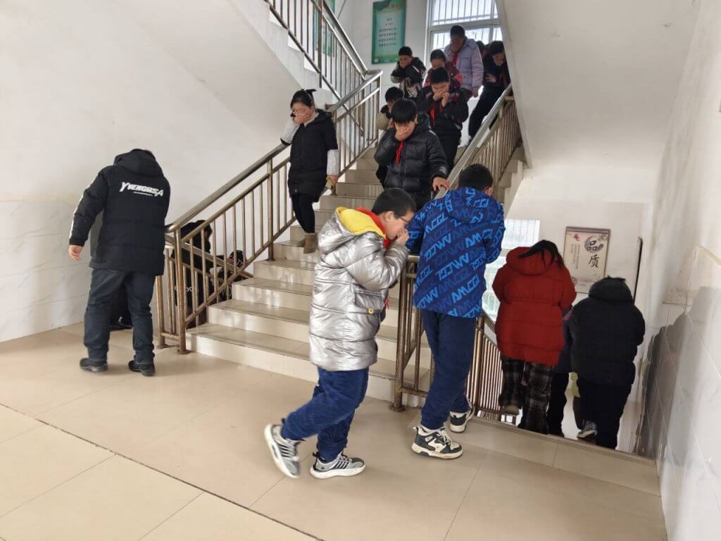 ~ 学生在老师们的指挥下,用手捂住口鼻,沿着学校指定楼梯口迅速、有序撤离到学校操场的安全地带。随着各班清点人数,并层层上报,短短56秒内,全校师生全部安全疏散完毕。