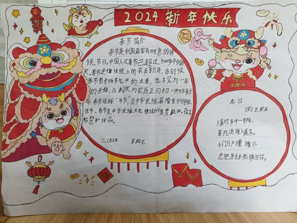 ~ 为更好的落实上“双减”政策,弘扬传统文化,2024年2月27日-29日,定远县炉桥一小教育集团开展了“我们的节日——春节”手抄报评比。比赛以“我眼中的春节”为主题,巧妙地把刚刚过去的春节和学习生活联系在一起。