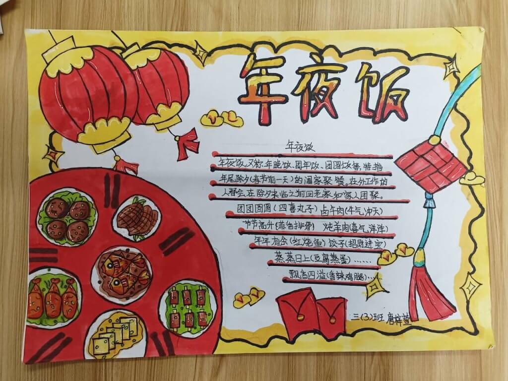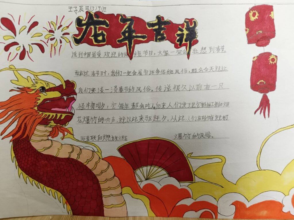 ~ 活动中,同学们积极收集材料,认真设计板面,呈现出一幅幅主题突出,内涵丰富,色彩明快的手抄报。此次手抄报比赛,不仅为同学们提供了一个展示和交流的平台,也让同学们体验到了春节特有的韵味,了解了春节的传统习俗,加深了对传统节日的认识,弘扬了中华传统文化。(供稿:葛慧 审核:黄升奇 审签:姜林皇 )