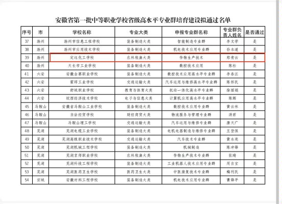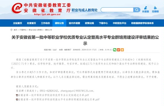 ~ 此次全省共拟认定171个优质专业,培育建设66个高水平专业群。定远化工学校四个专业拟通过省级优质专业认定,一个专业群拟入选省级高水平专业群培育建设名录,这是学校践行“提升学校办学层次,服务经济社会发展”办学方向的有力体现,学校将以此为契机,进一步强化专业特色,深化教学改革,提高教育教学和人才培养质量,为区域经济社会发展贡献一份力量。(图文:安徽省教育厅官网、杨桐;初审:高圣姬;复审:梁斌;终审:许孝峰)