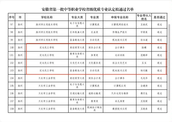 ~ 3月1日,安徽省教育厅发布了《关于安徽省第一批中等职业学校优质专业认定暨高水平专业群培育建设评审结果的公示》,定远化工学校申报的会计事务、运动训练、社会文化艺术、机电技术应用四个专业入选省级优质专业认定拟通过名单,作物生产技术专业群入选省级高水平专业群培育建设拟通过名单。