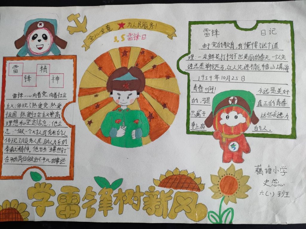 ~ 启动仪式结束后,各中队陆续召开雷锋主题队会,中队辅导员在会上组织队员宣讲雷锋的故事,引领少先队员去追寻雷锋的足迹,感悟雷锋的品行,体验雷锋的精神,号召少先队员发挥模范作用。此外各中队之间还开展主题比赛,以“学雷锋标兵”评选,黑板报,个人手抄报、绘画为主要比赛形式,并对优秀中队和突出队员进行表彰奖励。