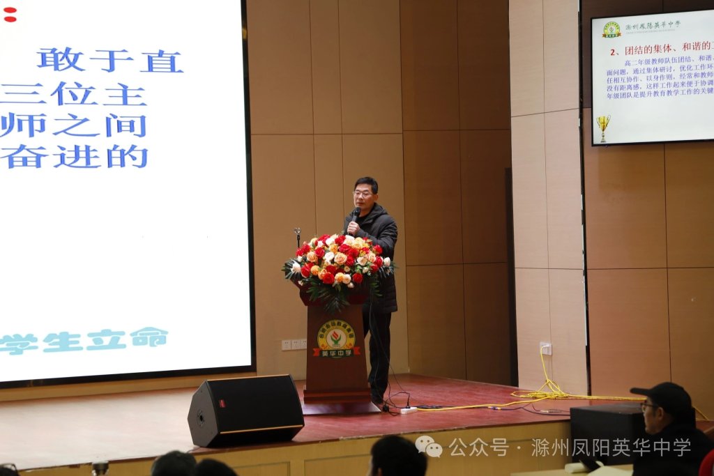 ~ 会议第三项,集团总校长张景作了《奋力推进二次创业,同心谱写发展华章》的重要讲话。张校长指出,过去的一年,我们坚持质量立效,砥砺拼搏创辉煌;我们聚焦学生发展,屡摘桂冠拔头筹;我们聚焦管理精细,上下同心见成效。凤阳校区的创立,教育形势的变化,让我们不得不进入二次创业。我们需要继续秉持初心,坚定笃行,奋力实干,为实现英华中学的再次腾飞敢想、敢闯、敢拼,共同绘制高质量发展的新华章。